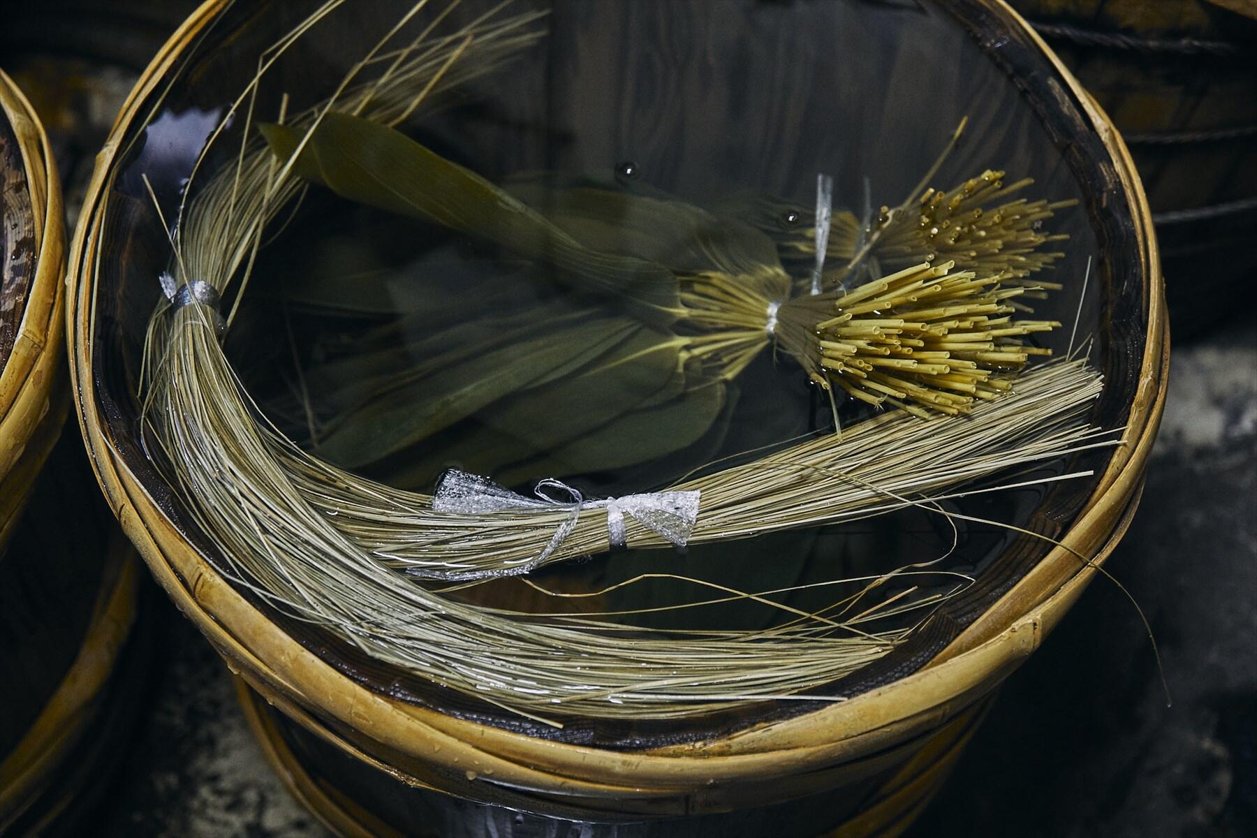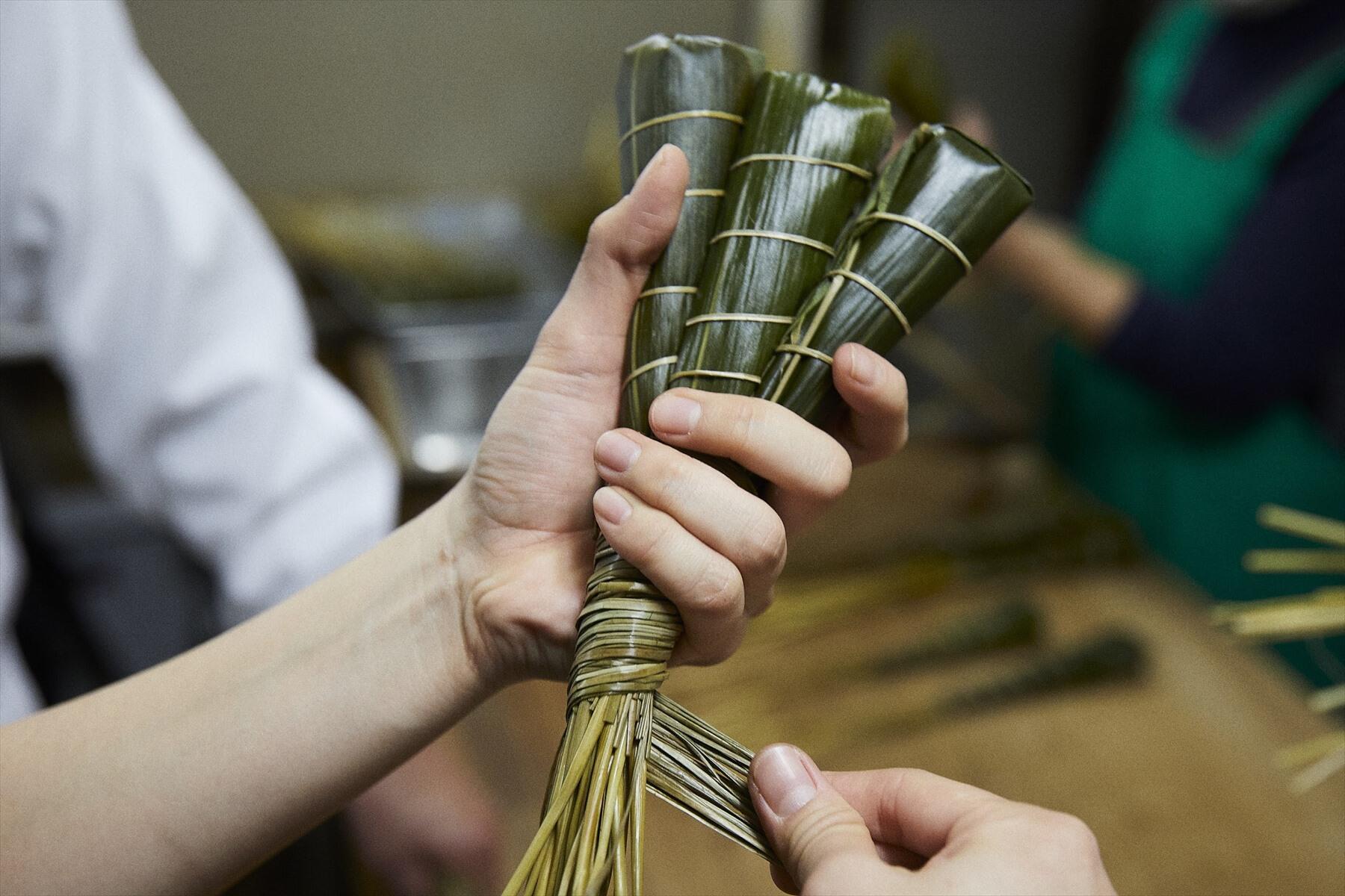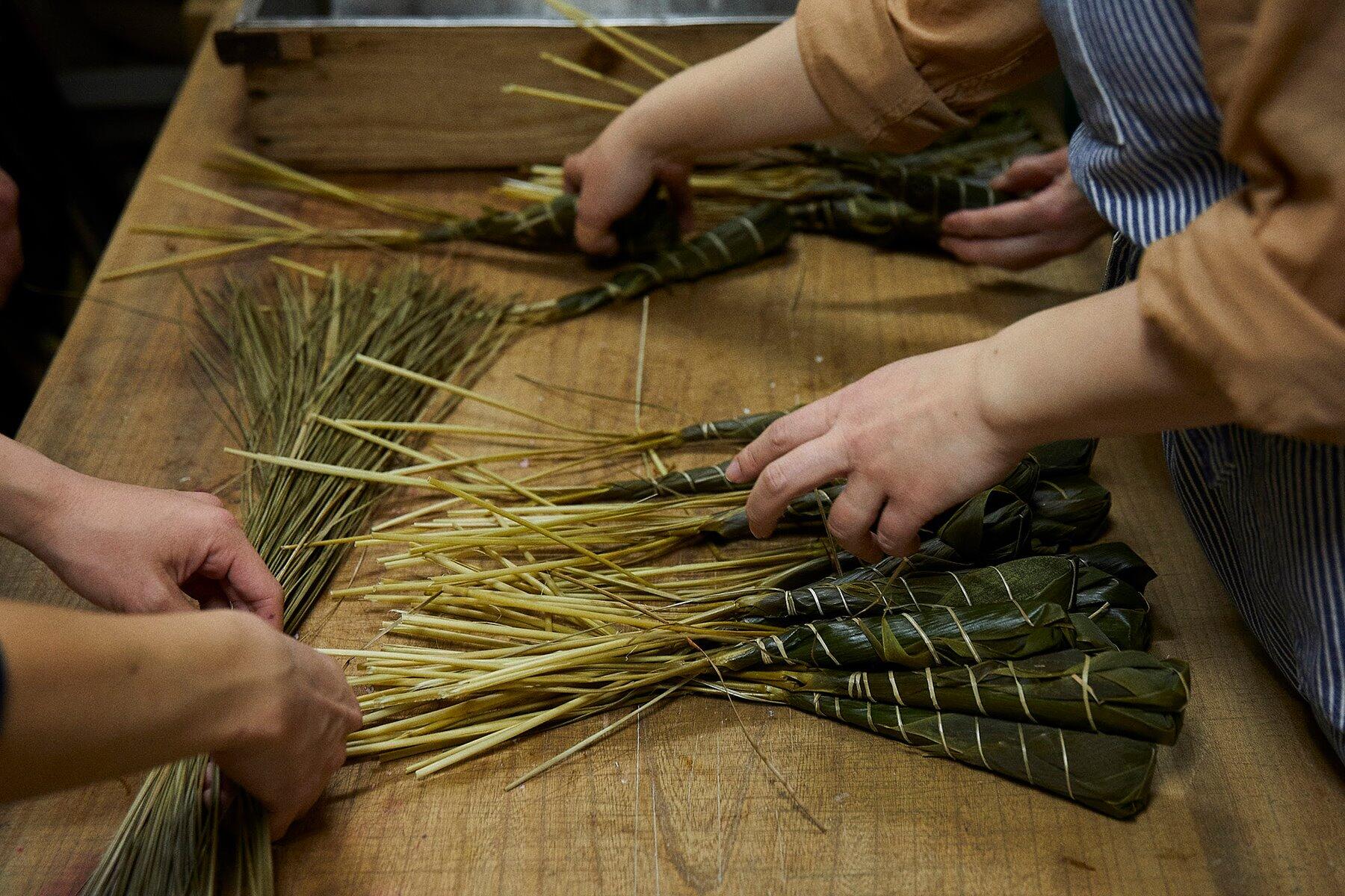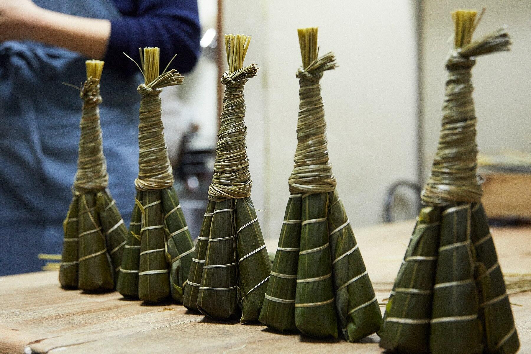 巻きあがった水仙粽、羊羹粽はそれぞれ、5本一組にして束ねる。い草できりりと巻かれた笹の葉の深い色とつや、すっと立っている様はなんともかっこいい。