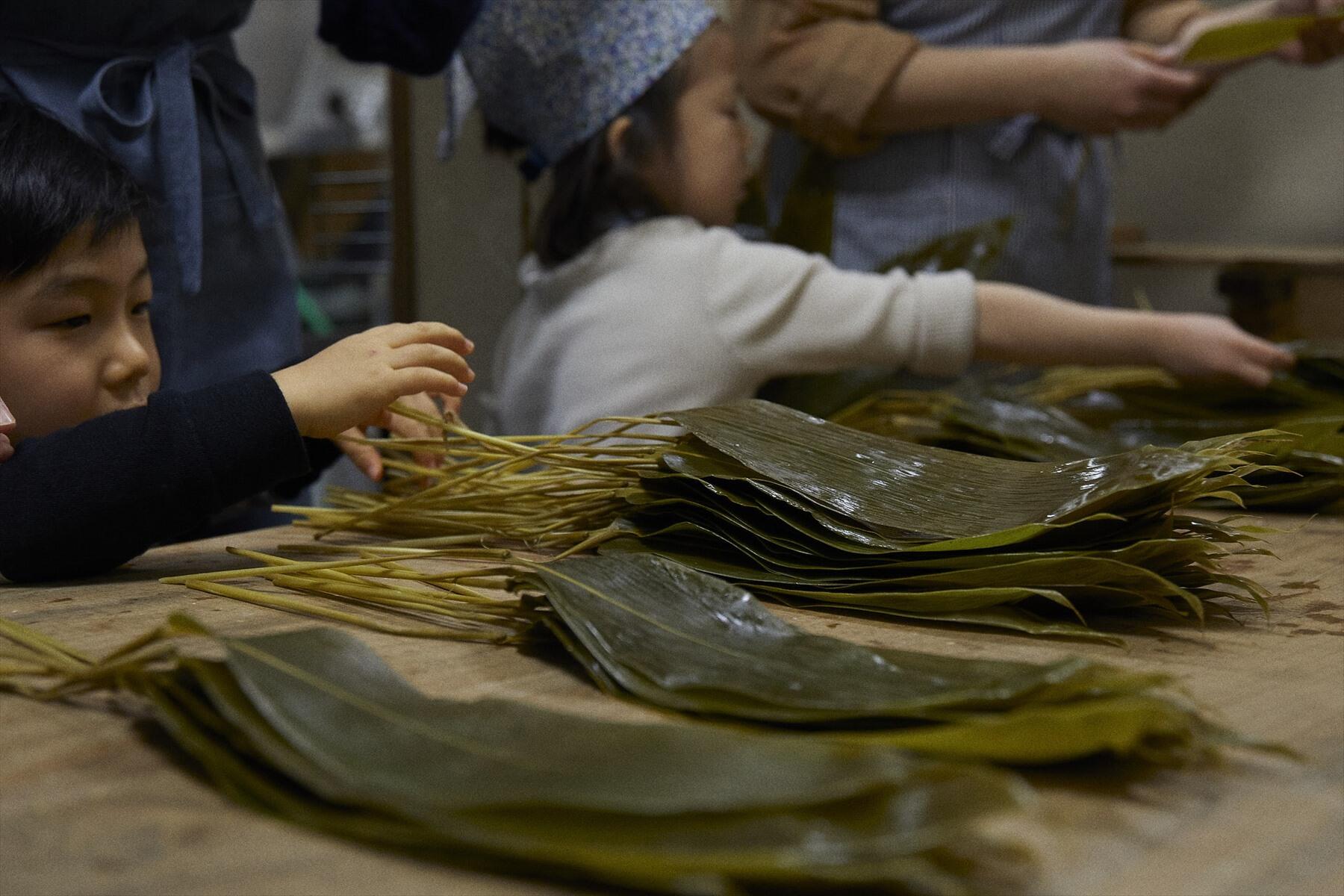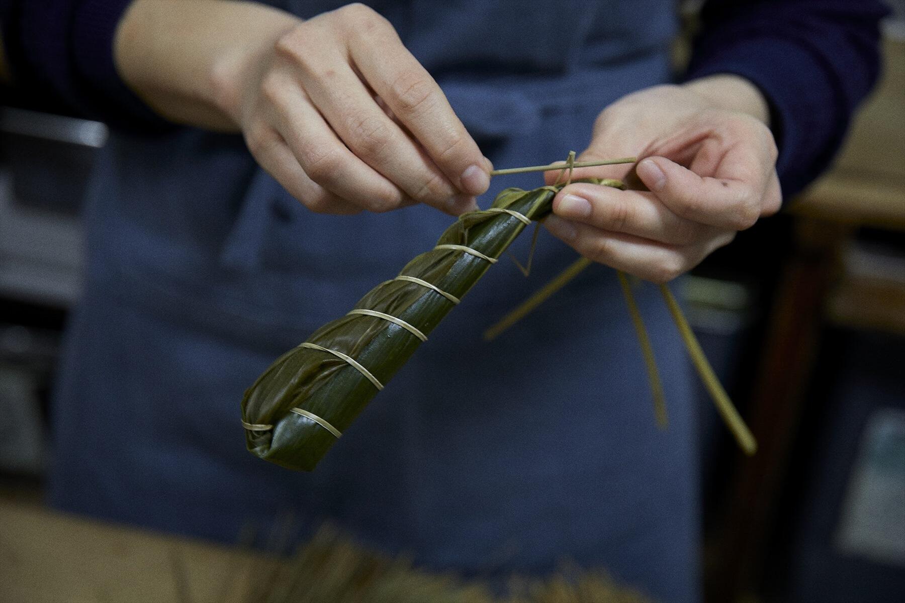 透明の水仙粽を巻き終えたら、漉し餡入りの羊羹粽も同じように作業する。作業場には、笹の葉の香りが広がる。
