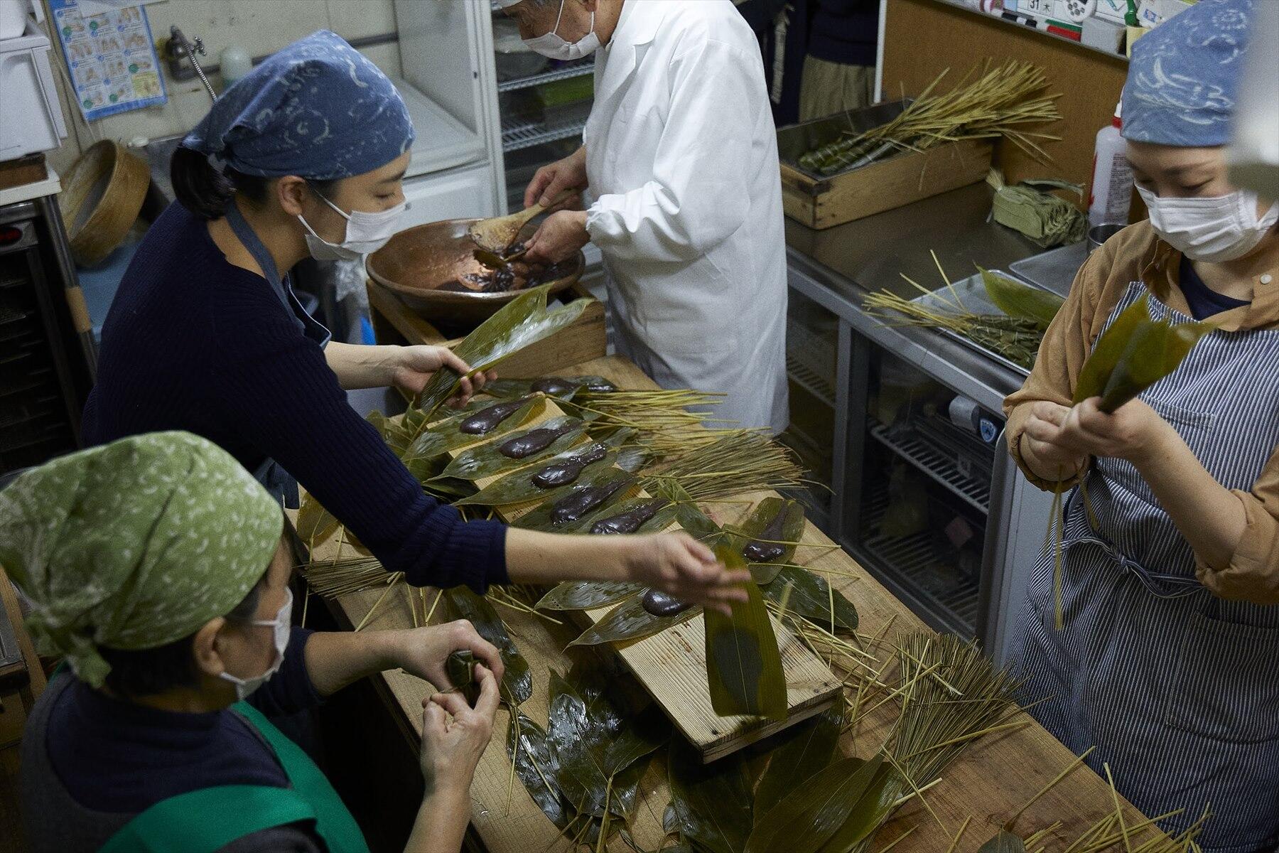 「粽(ちまき)はちょっと大変なんだ。いろいろ準備しないとならないし」と主人の渡邊好樹さんは言っていたが、店に伺うと、その意味がわかった。女将の英子さんだけでなく、娘の恭子さん、佳澄さんも作業場に入っていたのだ。