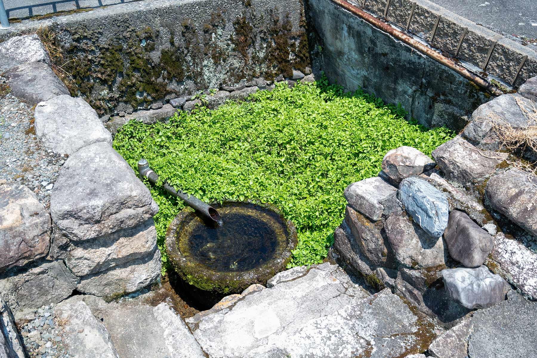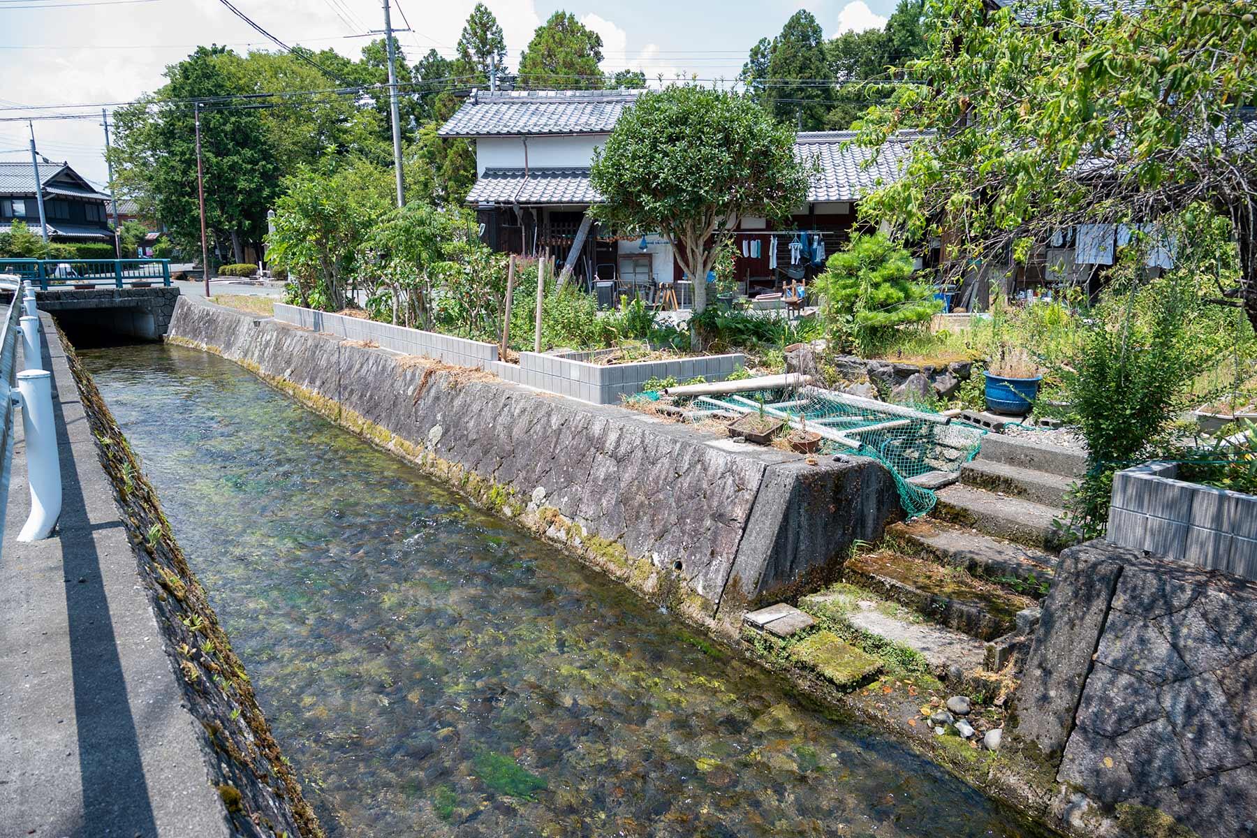 いったいどんな場所で作られているのだろうか。まず、石津さんに案内されて針江の集落を歩いた。驚いたのは至る所に湧き水の取水口「川端」がある。この伏流水は琵琶湖の西側に連なる比良山地に降った雪や雨が、伏流水となって湧いているのだそうだ。針江ではどの家の母屋にも川端があり、生活と密接につながっている。今でも泥のついた野菜を洗ったり、捥いだばかりのトマトや胡瓜を籠に入れて冷やすなど、もうひとつの「台所」として活躍していると石津さんは言う。