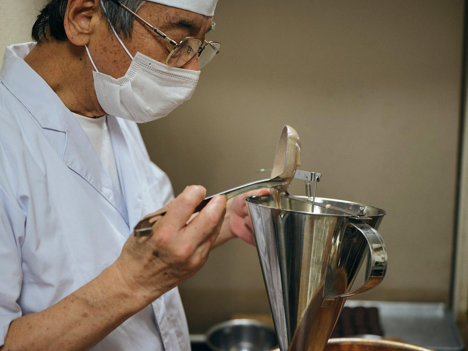 卵白が硬く泡立ったら、先ほど練った餡に、かるかん粉(うるち米の粉)、小麦粉を加えて混ぜる。めん棒の扱いがじつに巧みだ。さわり(打ち出しの銅鍋)に棒の先をつけ、ぐるぐると小さな円を描くように内側を伝いながら、餡と粉を混ぜていく。粉が飛び散っているところもすっと拭くようにして餡でなじませる。
