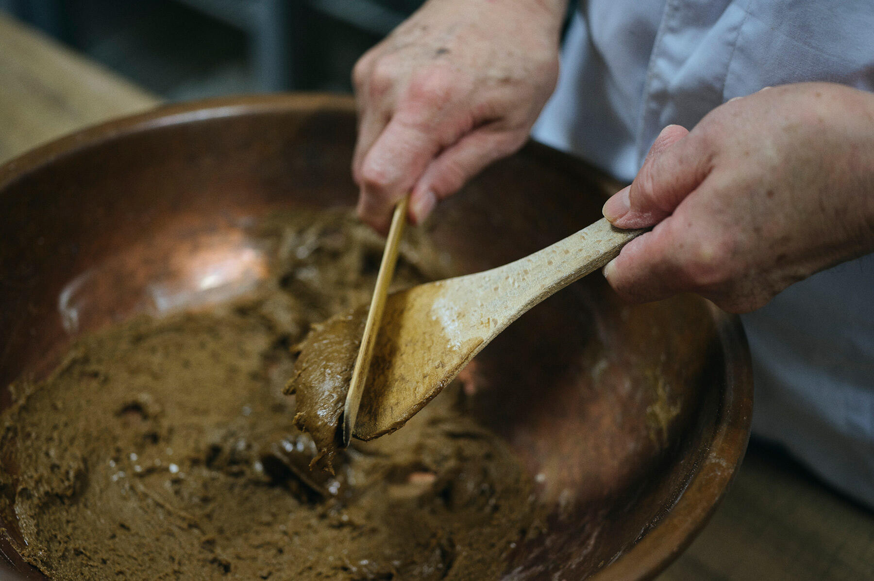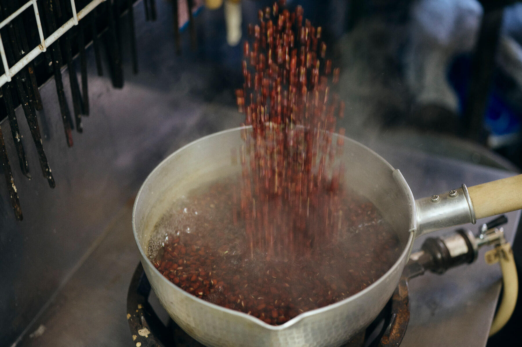 「他の作業の合間にする仕事だよ」と笑顔で言うが、ずっと同じリズムを刻み続けるような、地道で深い作業だ。今日は、粒餡を炊くところを見せてもらうことにした。