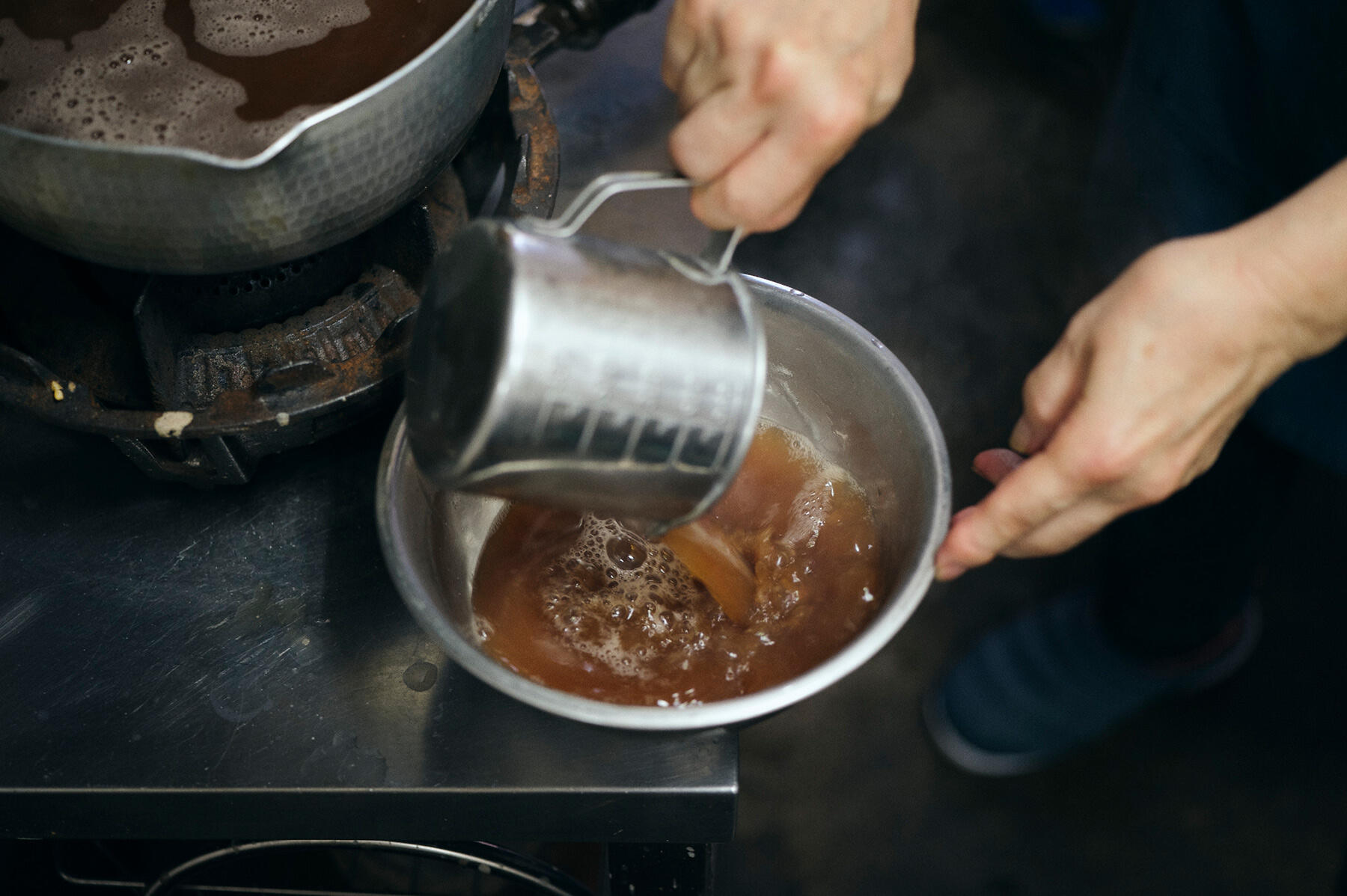 差し水をしたら、入れた分と同量の水をくみ出す。一定の水分量で煮続けるためだ。