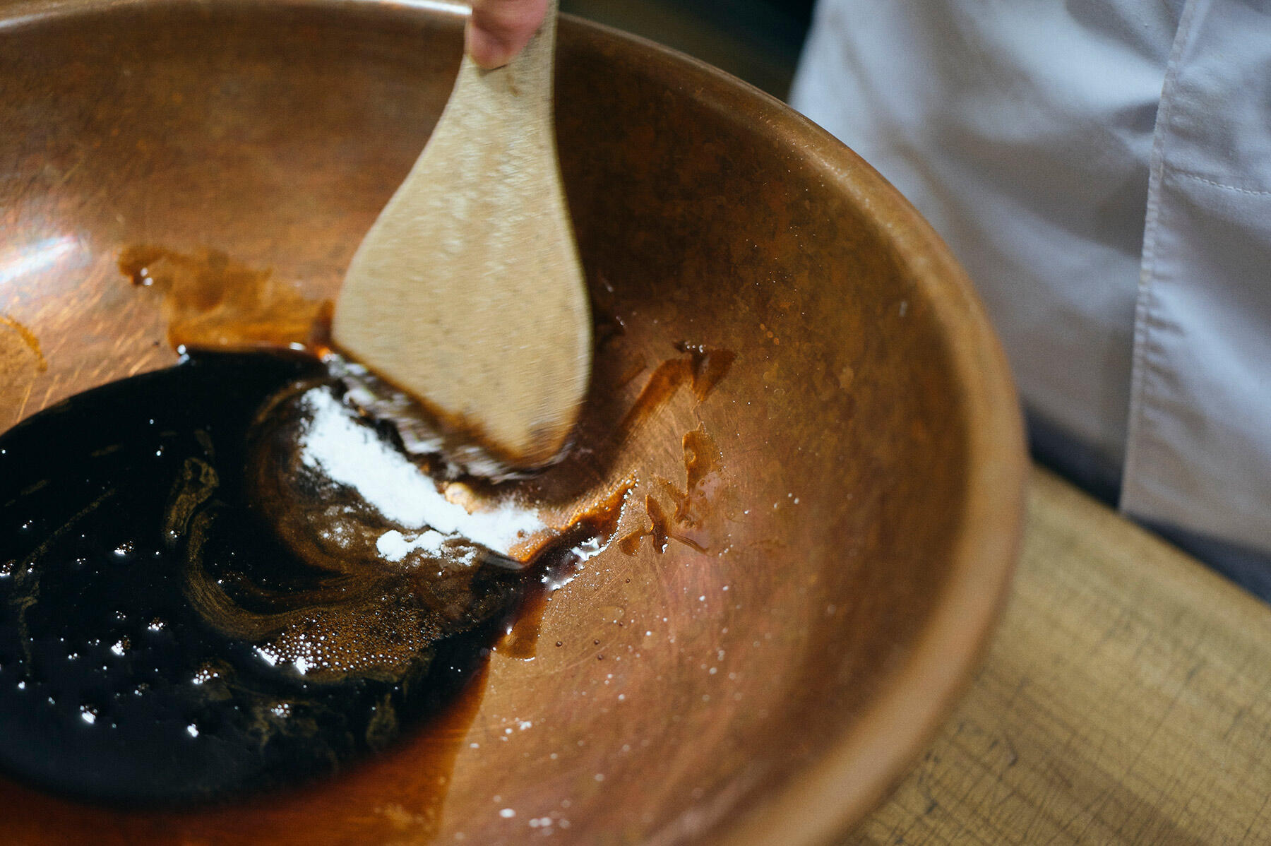 今日は、この粒餡と、自家製黒蜜入りの小麦粉の生地で「麦饅頭」をつくる。さわりに黒蜜と重曹を合わせ、ふるった小麦粉を加えて混ぜていく。
