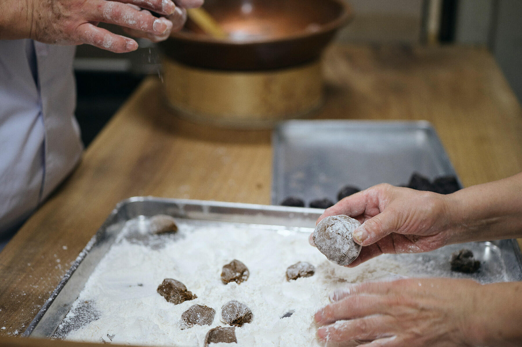 生地を取り粉(小麦粉)に移し、小さく丸めて粒餡を包み込む。