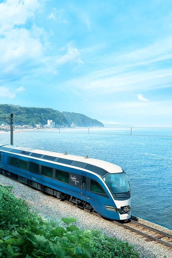 列車旅の魅力のひとつに、車窓からの景色がある。広い海を眺めるのが好きな人もきっと多いはず。そんな人にピッタリなのが、JR東日本の観光特急列車「サフィール踊り子」だ。「サフィール」とは「サファイヤ」を意味するフランス語。宝石のサファイヤのように青く輝く美しい伊豆の海と空にちなんで名付けられていて、この列車は東京駅、新宿駅〜伊豆急下田駅間に長く続いている海岸線をゆったりと走っていく。さらに、海と空の風景をより深く堪能できるよう、座席の窓は広くて大きく、天窓までついている。まさに、風景の中に身を置いているような気分になれる列車なのだ。
