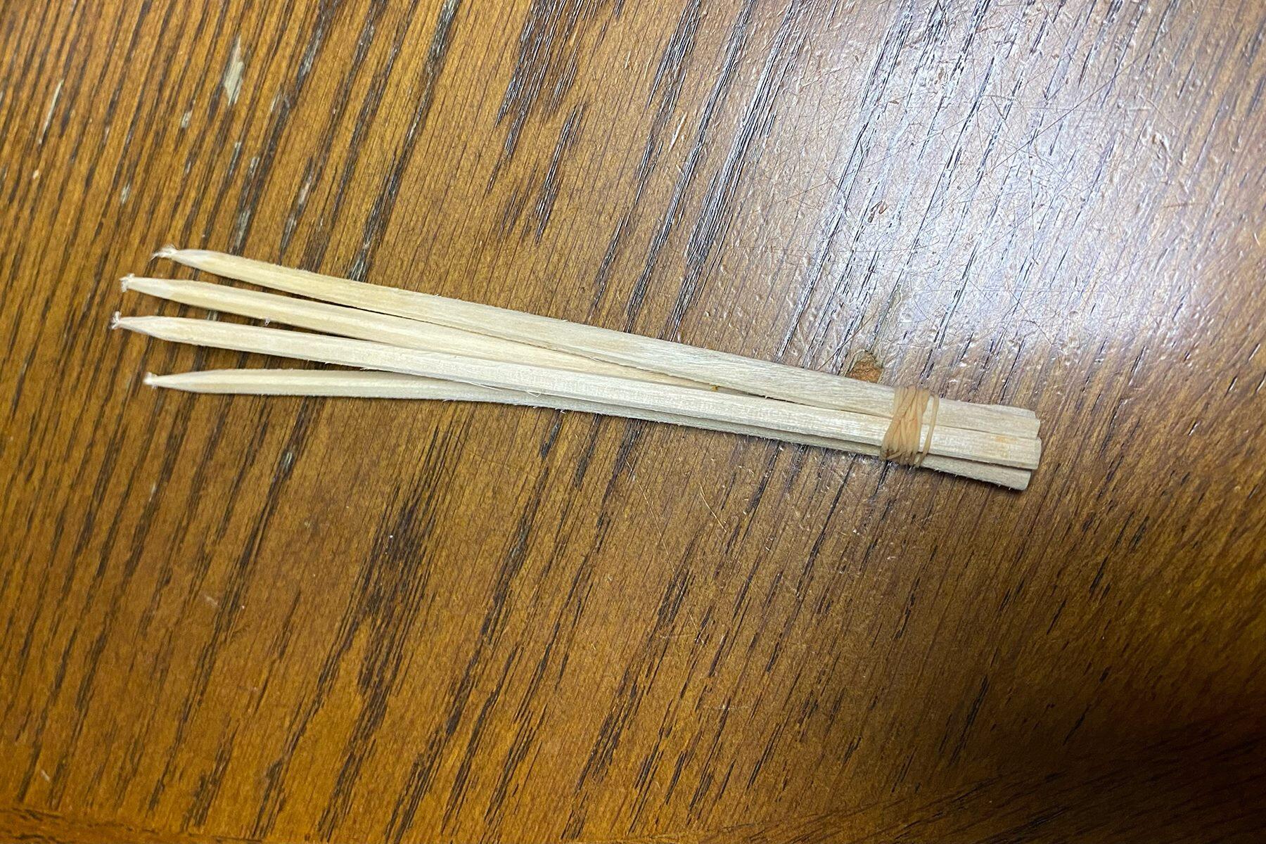 あるとき、母に改めてなたねのつくり方を見せてもらったことがある。すると取り出したのはなたね専用の箸。割り箸を切って先を尖らせ、4本を輪ゴムでとめた自作の道具だ。母曰く、先の尖り具合、長さ、箸の開き具合、すべてがなたね仕様になっているという。こんな秘密兵器があったとは。