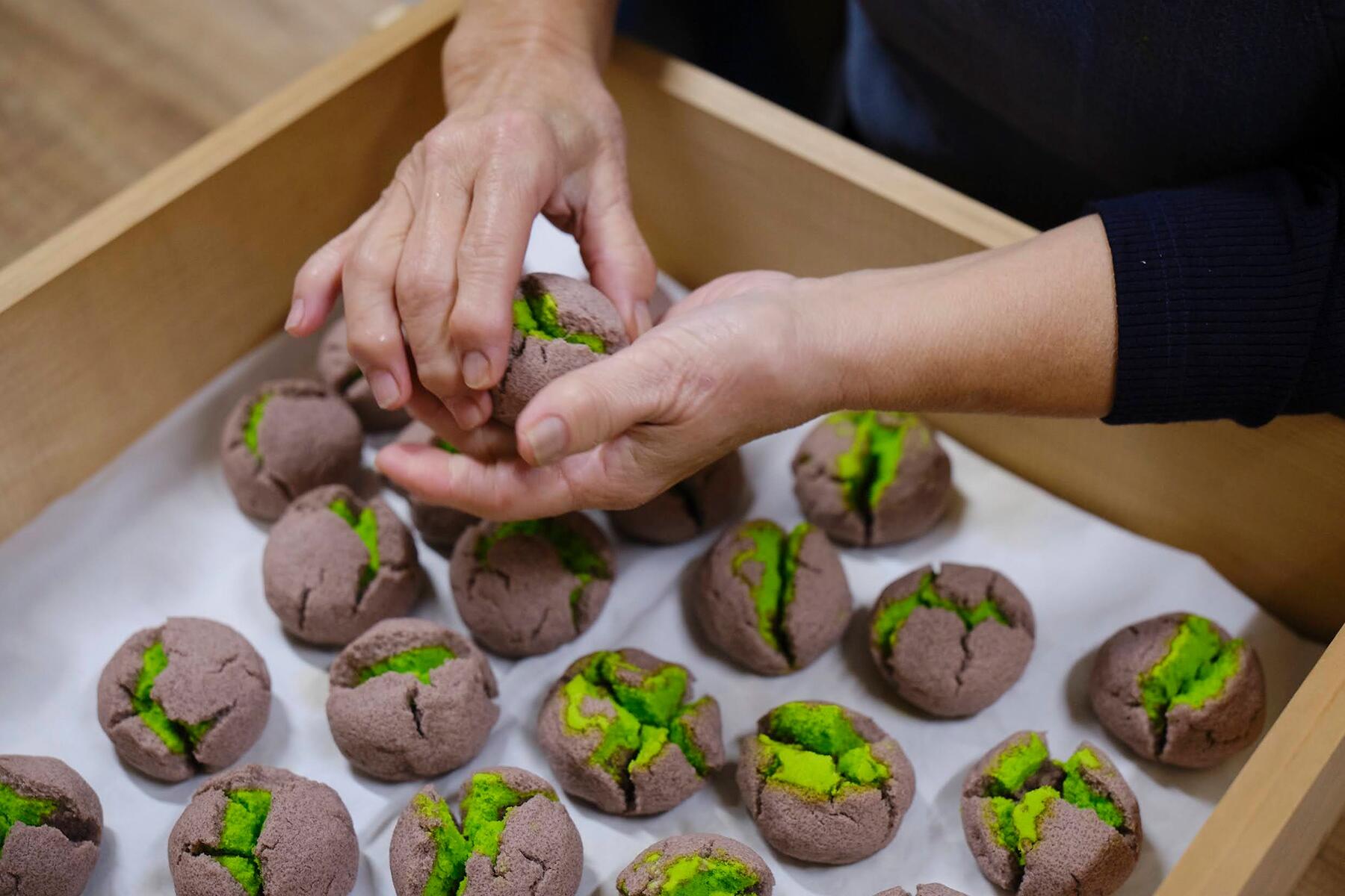 緑の餡のエリアが広がると生地が割れ過ぎてしまうから、漉し餡をかぶせ、中に閉じ込めるようにするのだとか。