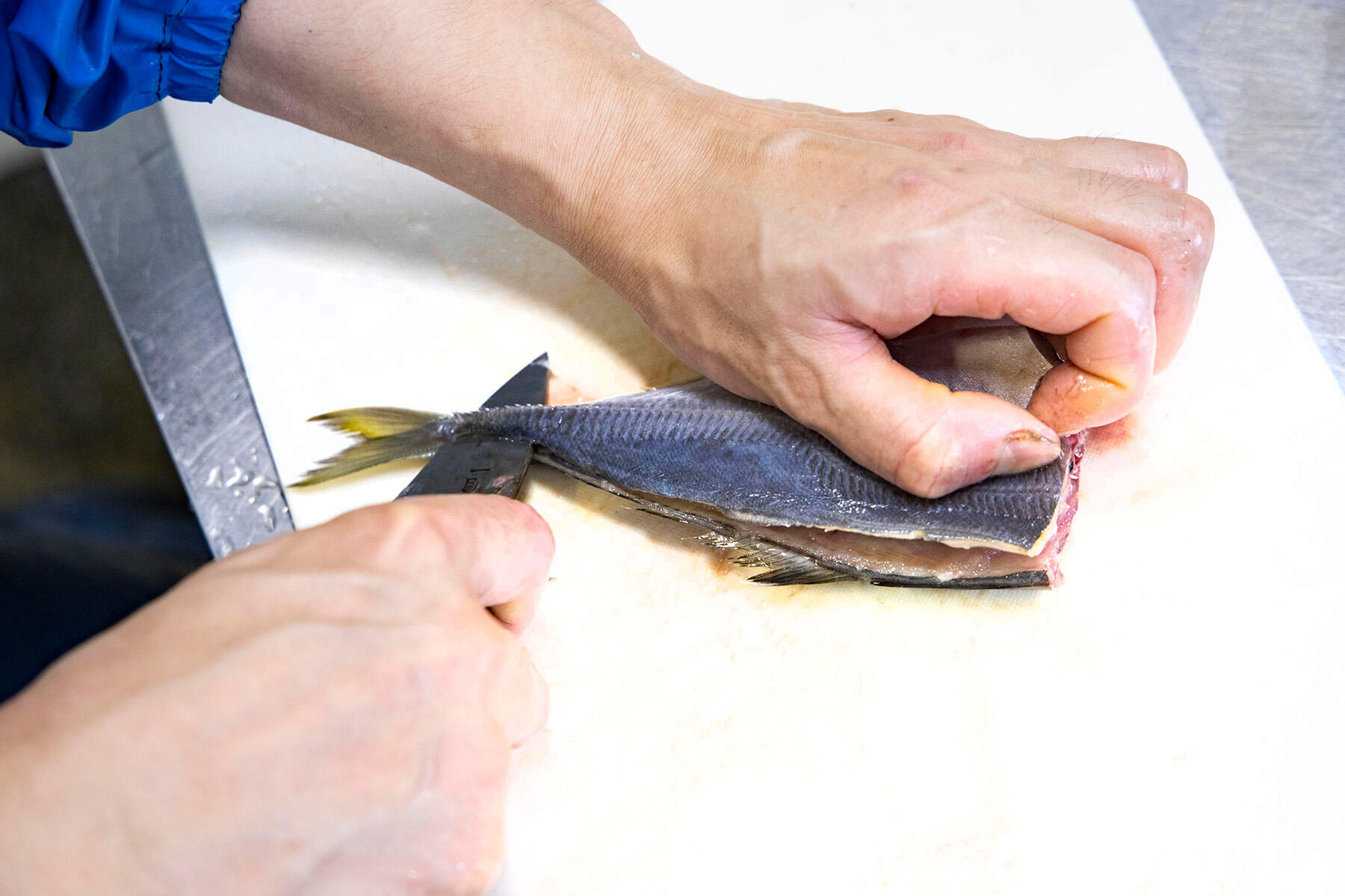 残った片側は皮を上、身と骨を下にして置く。中骨と背骨の上に包丁の刃を滑らせながら、腹側から背側まで一気に切り込み、中骨を取り外す。