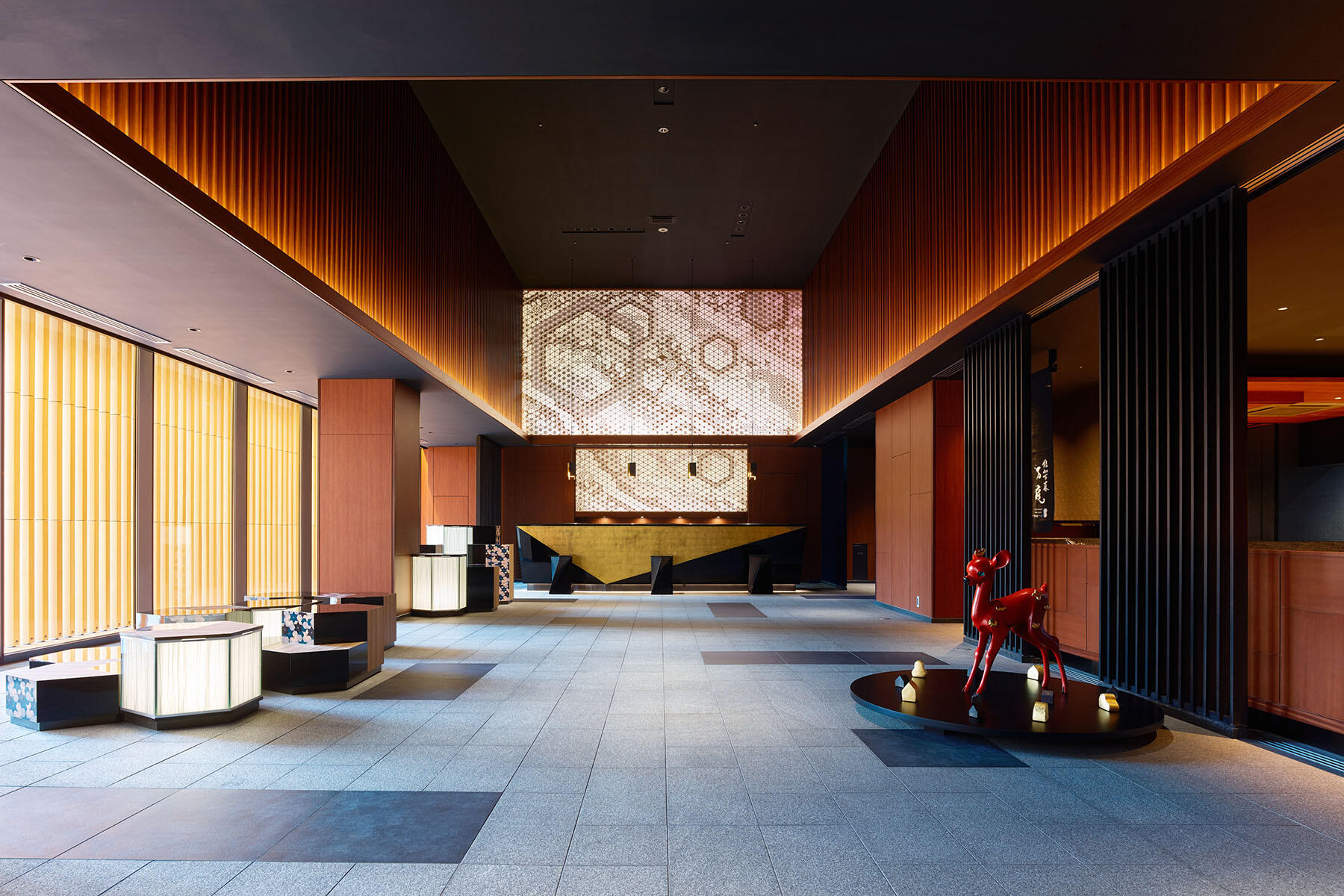 エントランスロビーにも、職人技が光る伝統工芸のエッセンスが詰まっている。正面には石川県の伝統工芸である組子アートが広がり、床は金沢城下の石畳を模した石貼り、カウンターには華やかでありながらモダンな金箔パネルが。ロビーの随所には、金沢とゆかりのある工芸作家や現代アーティストによる作品が展示されているから見逃せない。