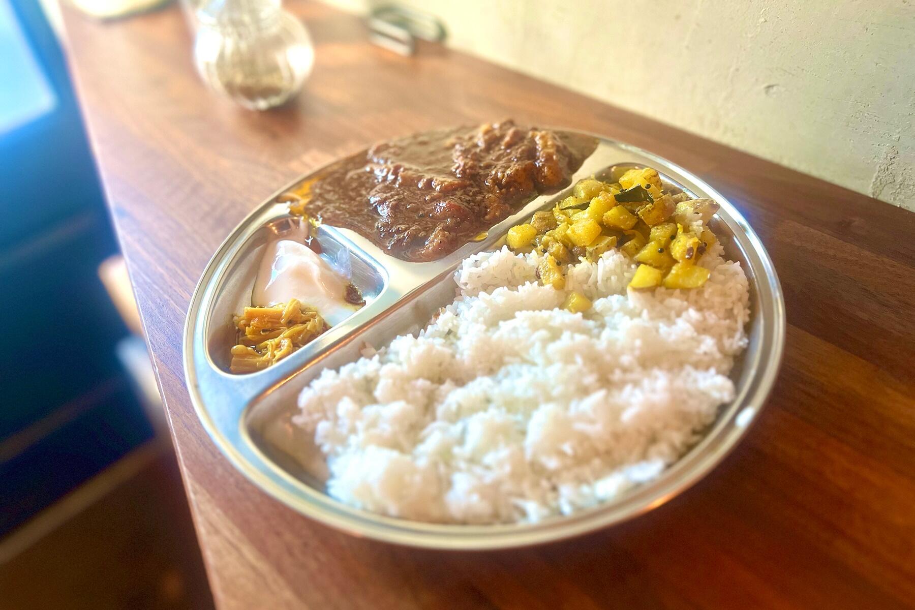 初めての訪問時はメニューにある数種類のカレーのうち、ポークカレーをお願いすることにした。はたして、登場したポークカレーは、その精度の高さに思わず唸ってしまった。個性がありつつも素晴らしいバランスのスパイス使いにやられたのだ。これは癖になる、きっと近々再訪してしまう、という確信が湧く。