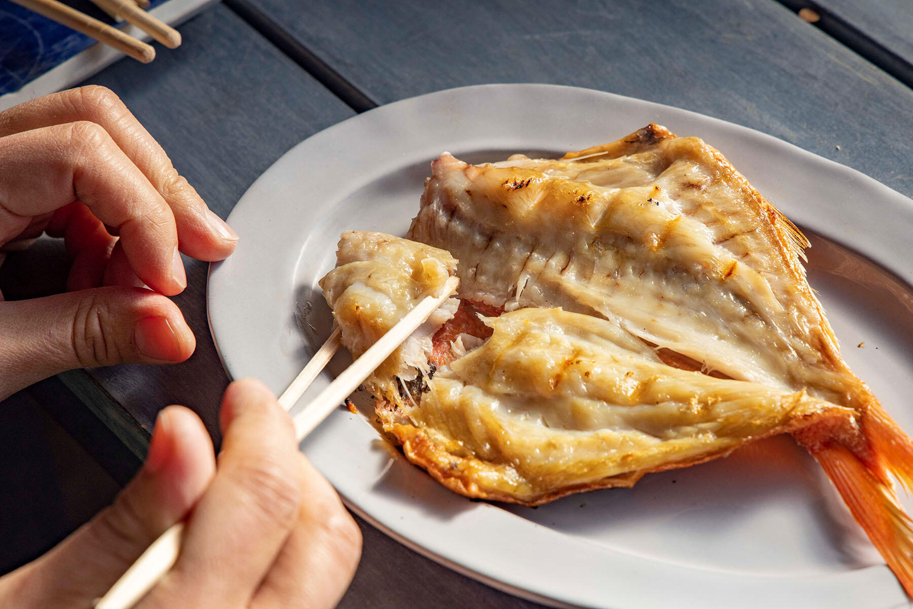 いよいよ焼いて食べよう。内田さんによれば、金目鯛の干物を焼くときは「焼き過ぎかな」と思うぐらいがちょうどいいらしい。干すときと逆だ。特に鱗がある皮目はちょっと焦げるまで焼いて豪快に食べられるようにしたい。