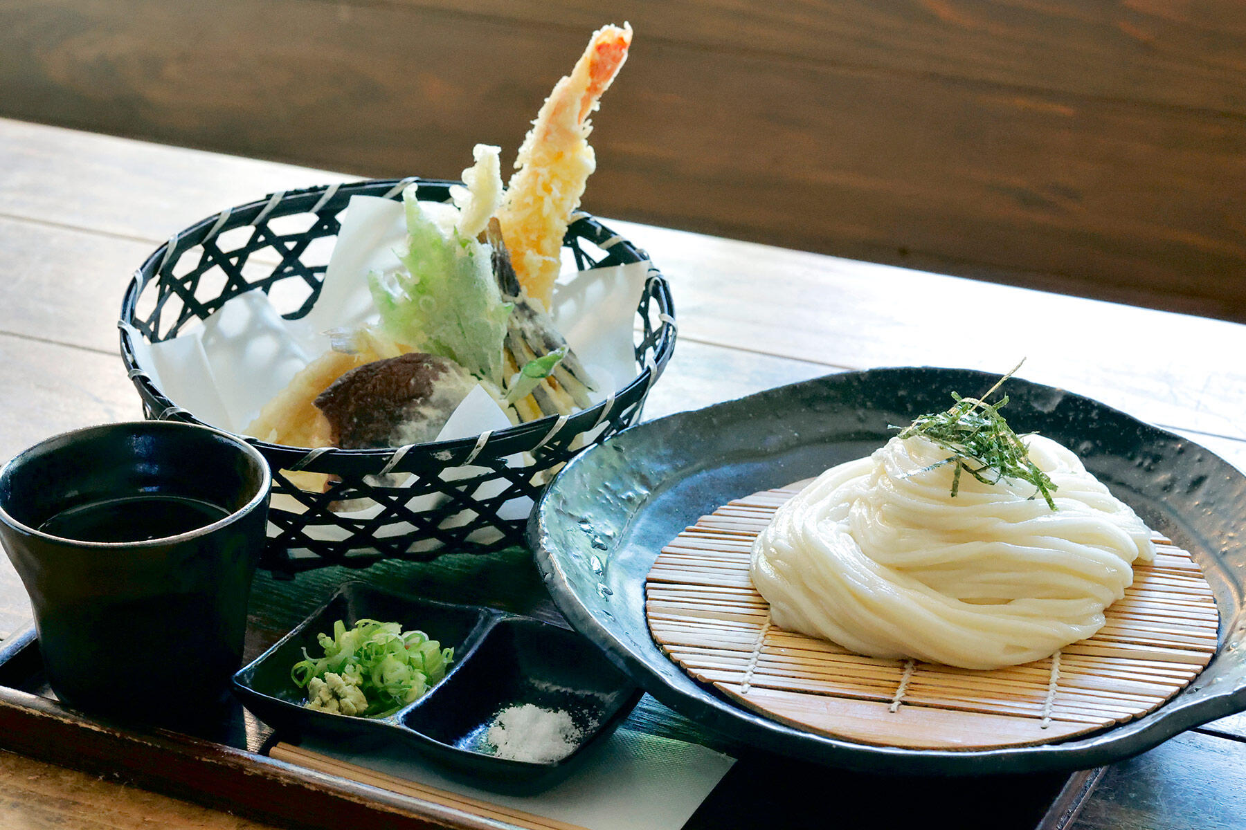 これからの時季なら涼やかなざるで、その真意を堪能してほしい。麺をすすれば、柔らかいのにもちもち、程よいコシの強さが、グラデーションのように広がる。しかもつゆが味わい深い。昆布だしをベースに、鯖・鰹・メジカ・ウルメ・煮干し・椎茸などから白だしをとり、かえしを加えて寝かすこと2週間。角の取れた旨みが印象的だ。「お薦めは、おうどんと天ぷらの盛り合わせ。天ぷらの量が凄くて。だけど軽やかだからスルスルいけます!」