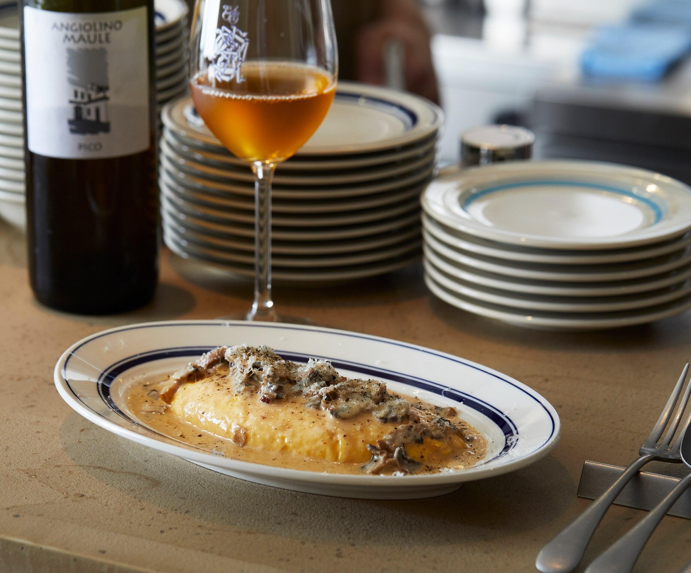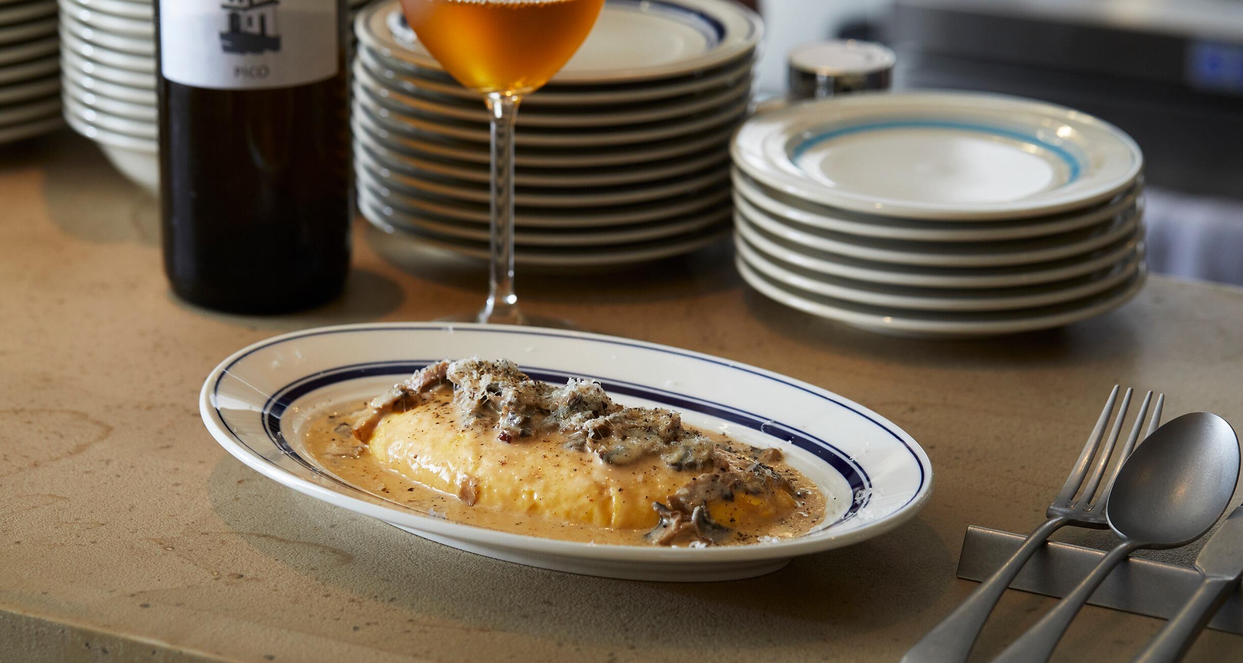 オムレツから立ち上る湯気がいきなり旨い。マッシュルームとベーコンの味が凝縮したクリームソースは香りも味わいも濃厚。オムレツは誰もが心ときめく絶妙なふわっふわ加減。上にかかっているチーズが本当においしいなぁと思って聞いたら、まさかの答えが返ってきた。「パルミジャーノだと、馴染みがありすぎて、ちょっと安っぽくなってしまう。ペコリーノでもいいんですが、もう少しコクを足したい。という流れでコンテを使っています」とシェフ。口の中がソースと卵とコンテチーズで満たされる。「立ち飲み」から連想される料理のクオリティとは、次元が違う。