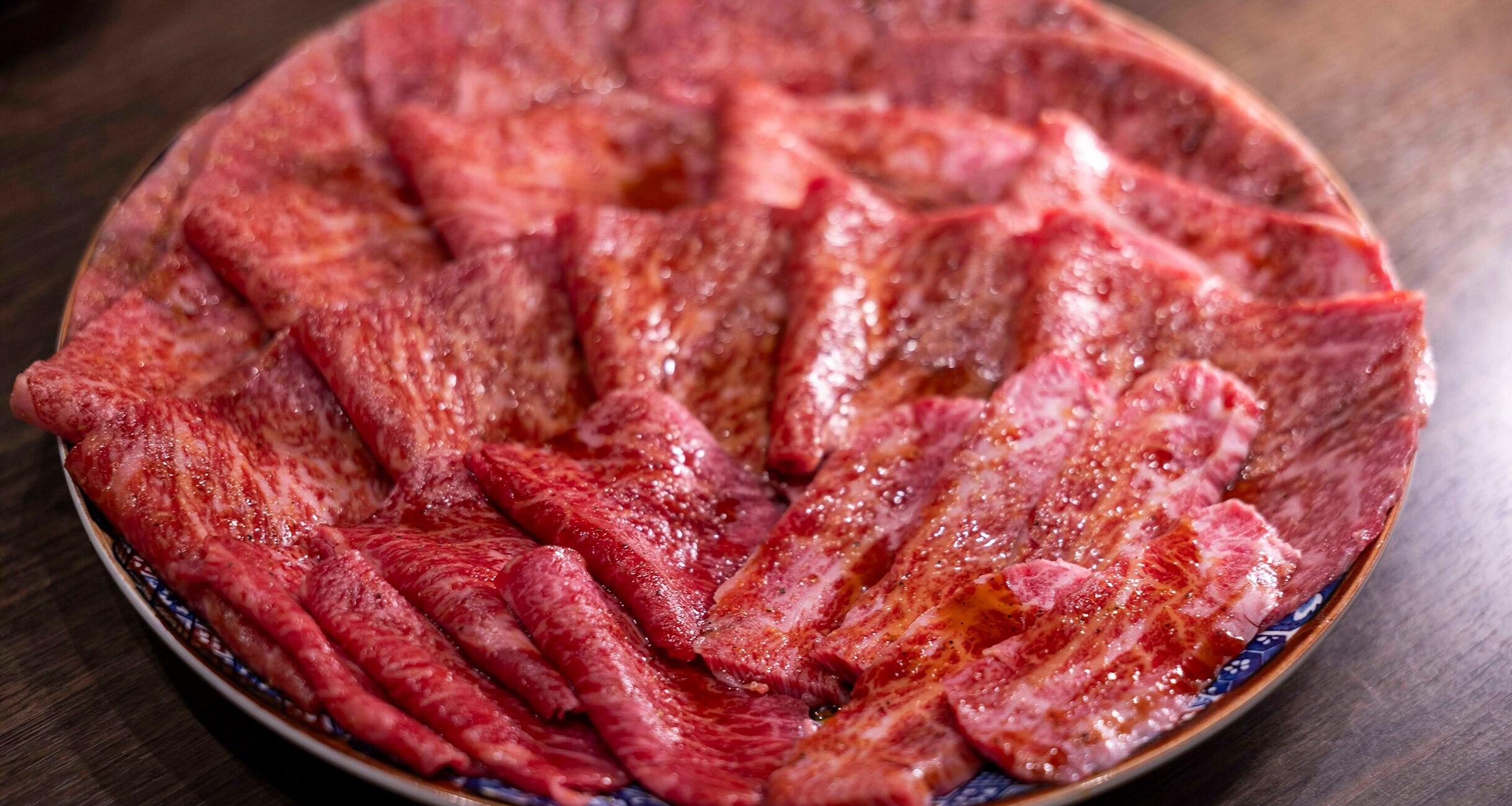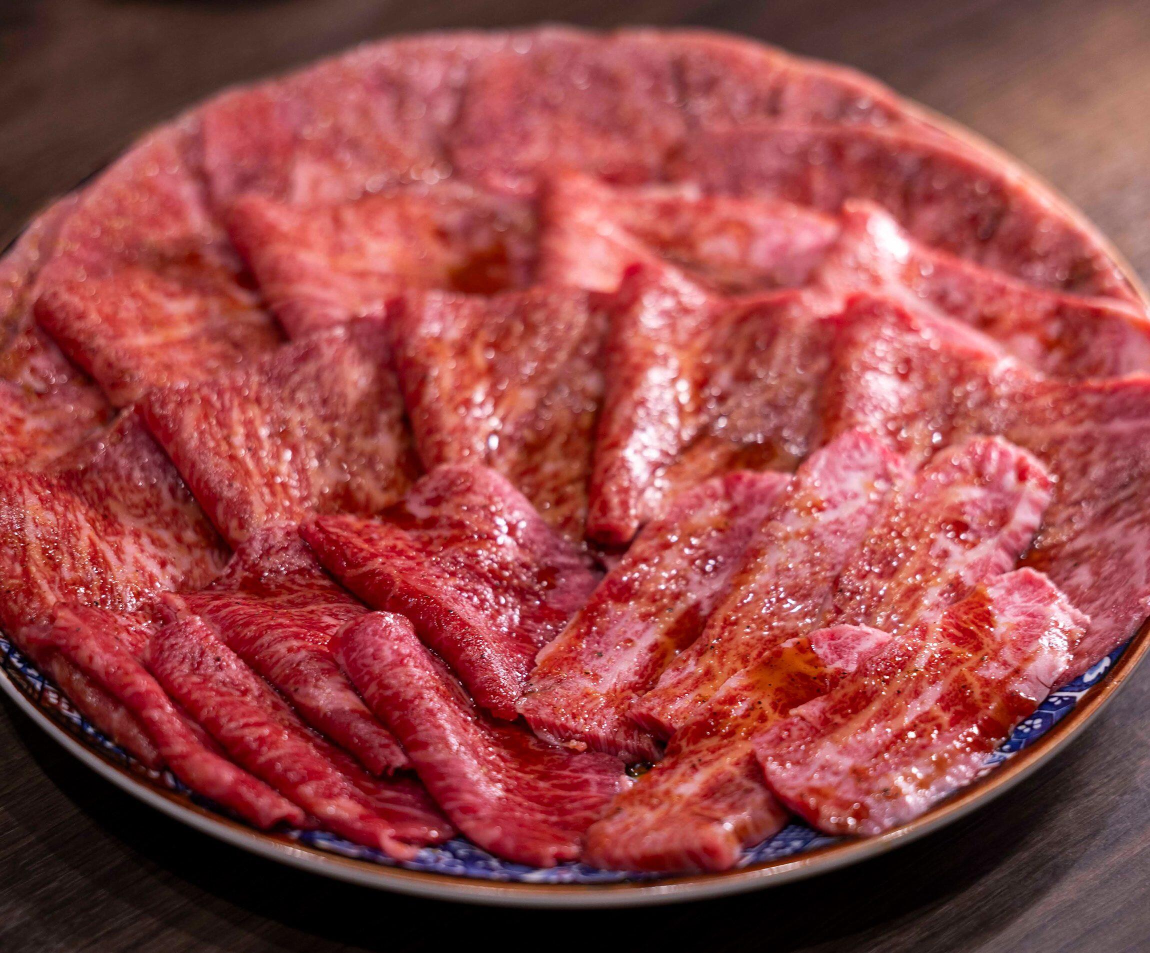 薄切りのスライス肉は、業務用でも評判の高い「なんつね」のスライサーから美しい断面とともに切り出される。少し厚い焼肉カットの肉は手切り。肉の部位や提供スタイルに応じてその形は自由自在に、美しく変化する。