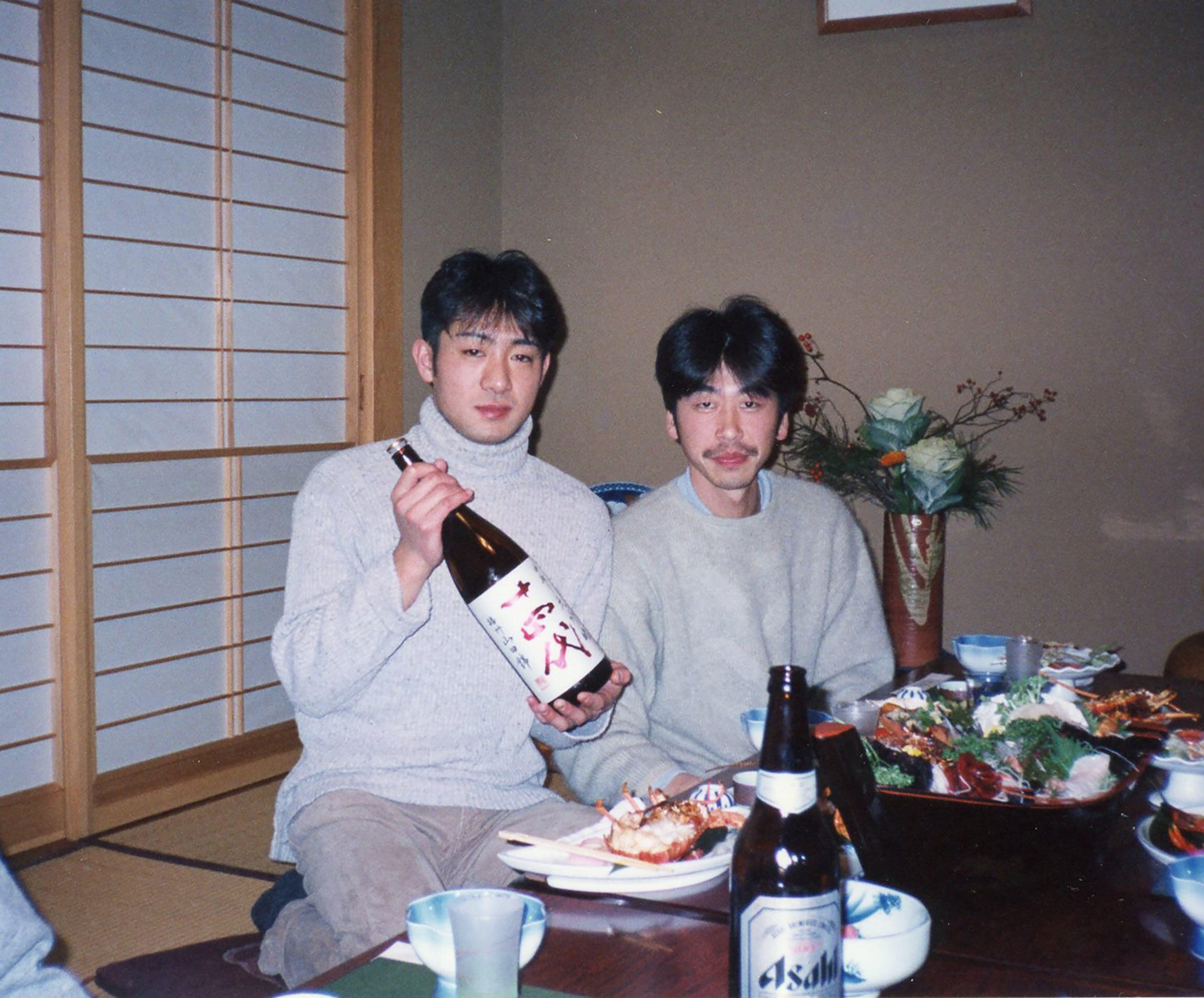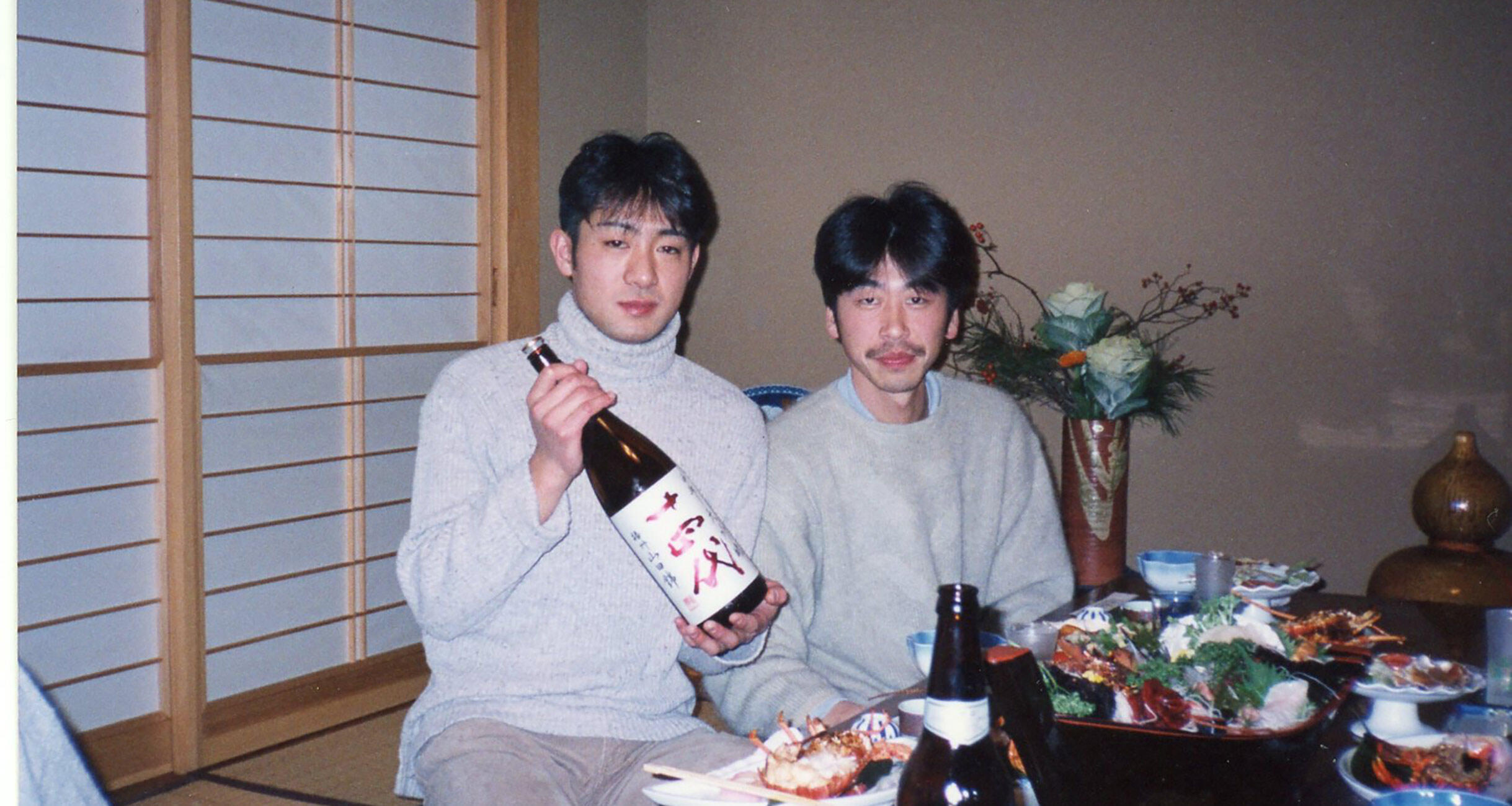 「十四代」蔵元杜氏・高木顕統さん(2023年に辰五郎を襲名)が、“唯一の弟子”と認め、醸造技術を高く評価している「東洋美人」蔵元杜氏の澄川宜史(たかふみ)さん。澄川さんの大学3年時の研修先が高木酒造だったことから、1996年に二人は出会った(トップの写真は研修最終日に開かれた送別会での高木さん=右と澄川さん)。研修での出会いは、その後の二人の人生にどう影響したのだろうか。