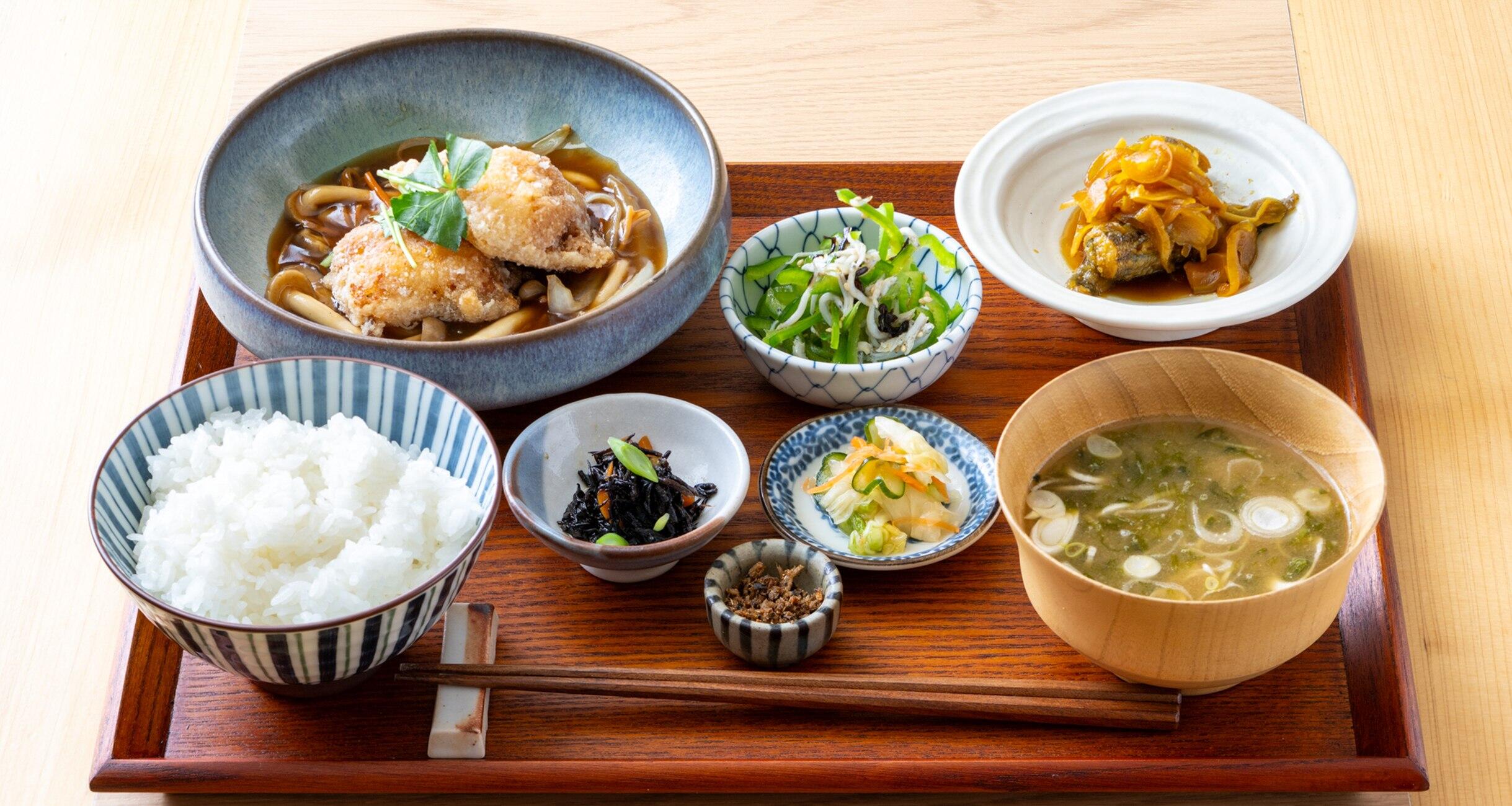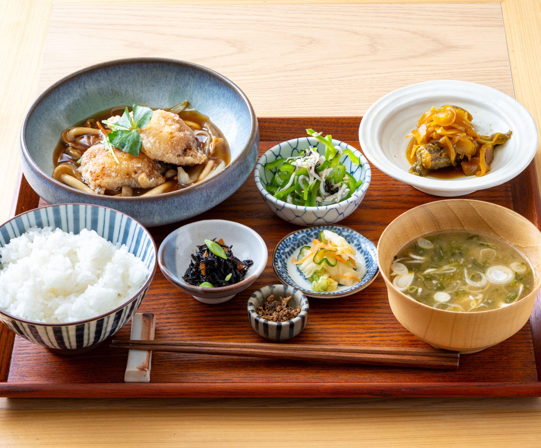 副菜の「メヒカリのカレー南蛮漬け」も、もはや“ご飯泥棒”の域。メヒカリはふわっとした身と上品な味わいが魅力の白身魚で、福島では古くから親しまれている。スパイシーで甘酸っぱい漬けダレが絡み、シャキシャキの香味野菜が爽やかなアクセントに。「カレーの風味が食欲をそそり、ご飯が進みますよ」と、佐藤料理長が話すとおり、「福、笑い」との無限ループで箸が止まらない。