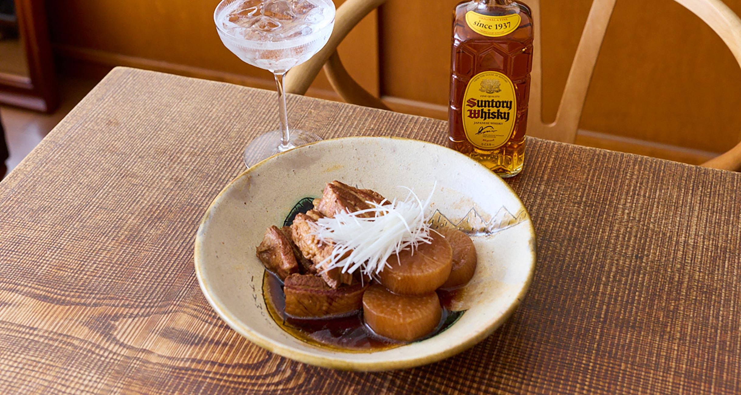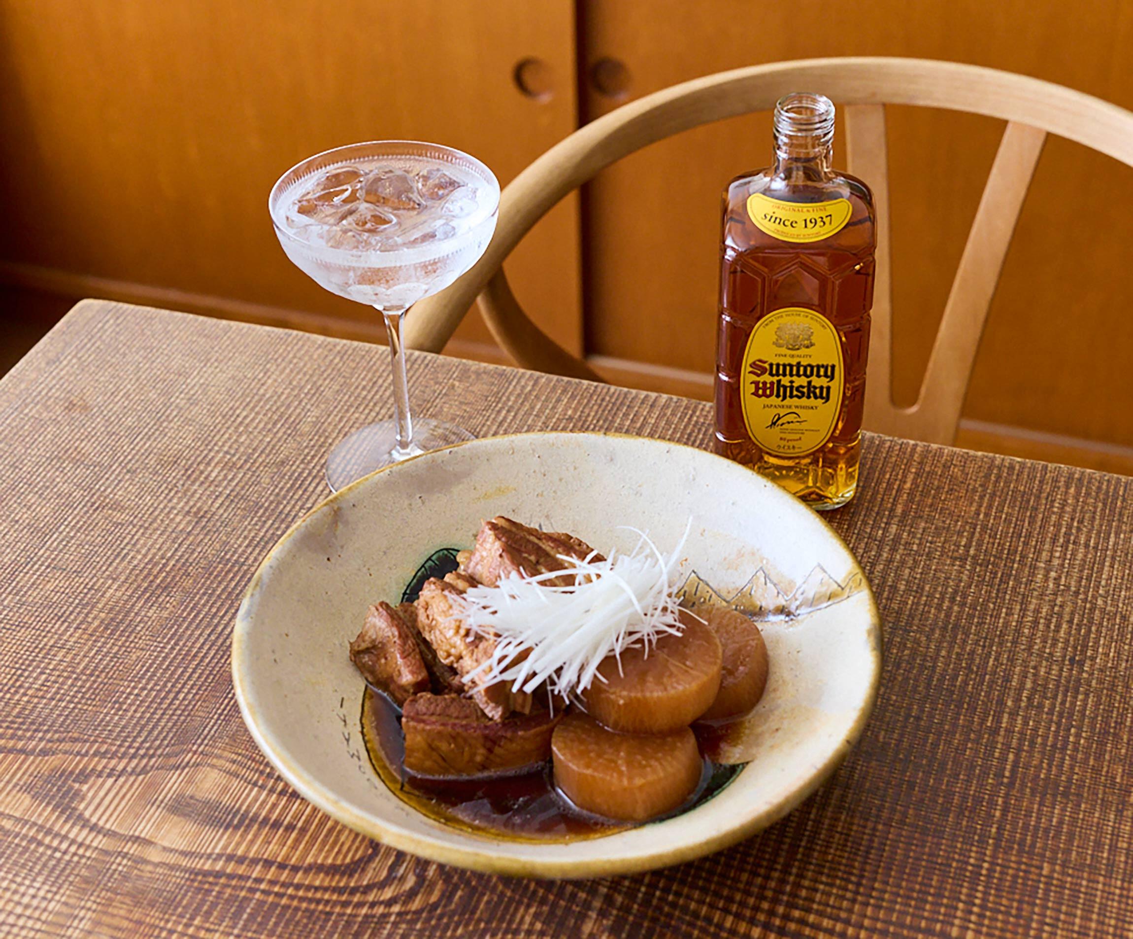 「フロートのトップのところの濃さが、豚肉の甘さや煮汁のしみた大根によく合います。フロートという飲み方を選んだのも、最初の一瞬にあるウイスキーのおいしさを、甘味や旨味の濃い料理に合わせるためです。フロートにすると、最初のひと口、ふた口に、ウイスキーってこんなに旨いんだという気づきがあると思います。角のハイボールは若い人にもよく知られていますが、ハイボールだけでなく、自分なりの好きな飲み方を見つける楽しみもあることを知ってほしいですね」