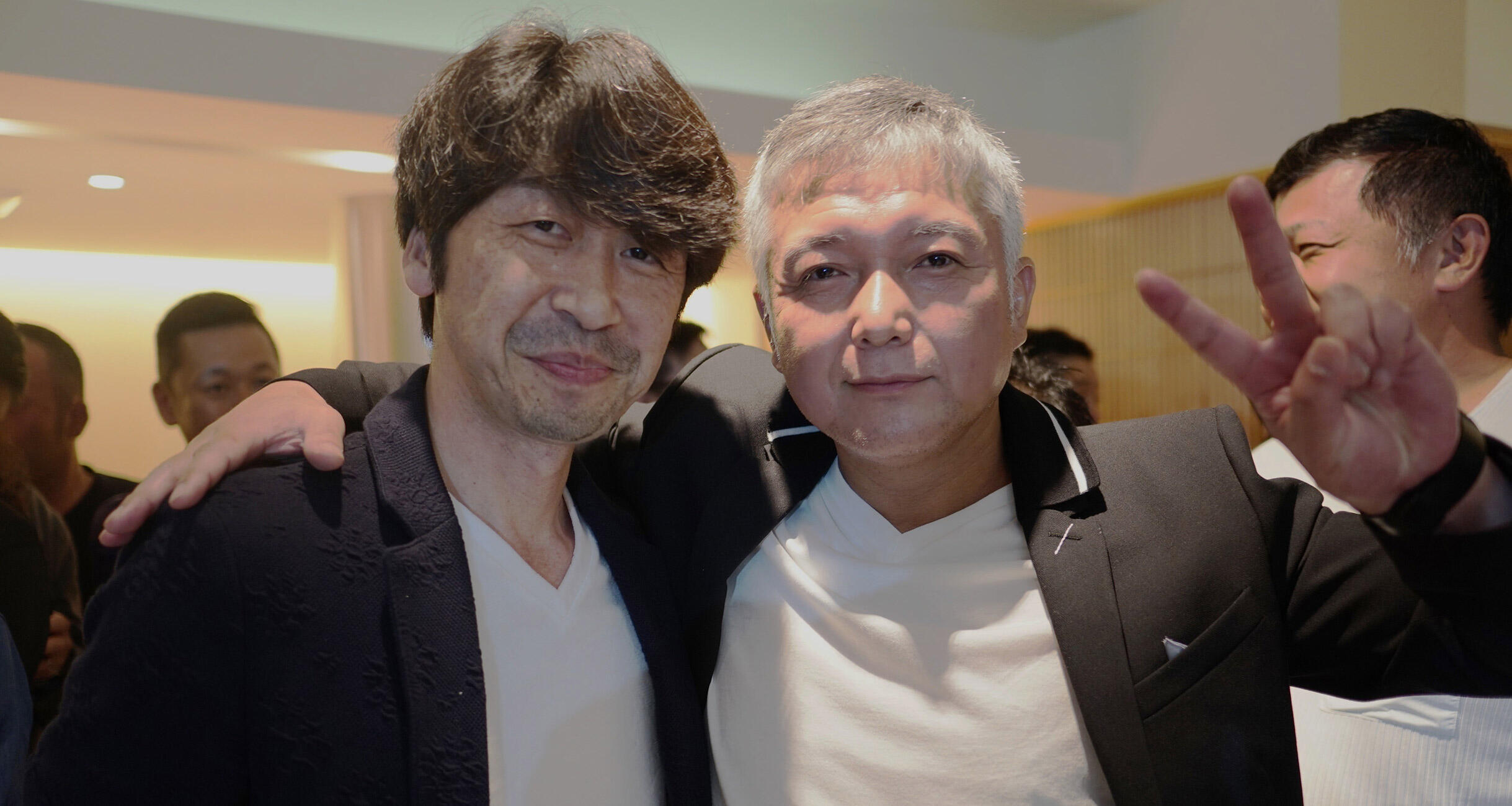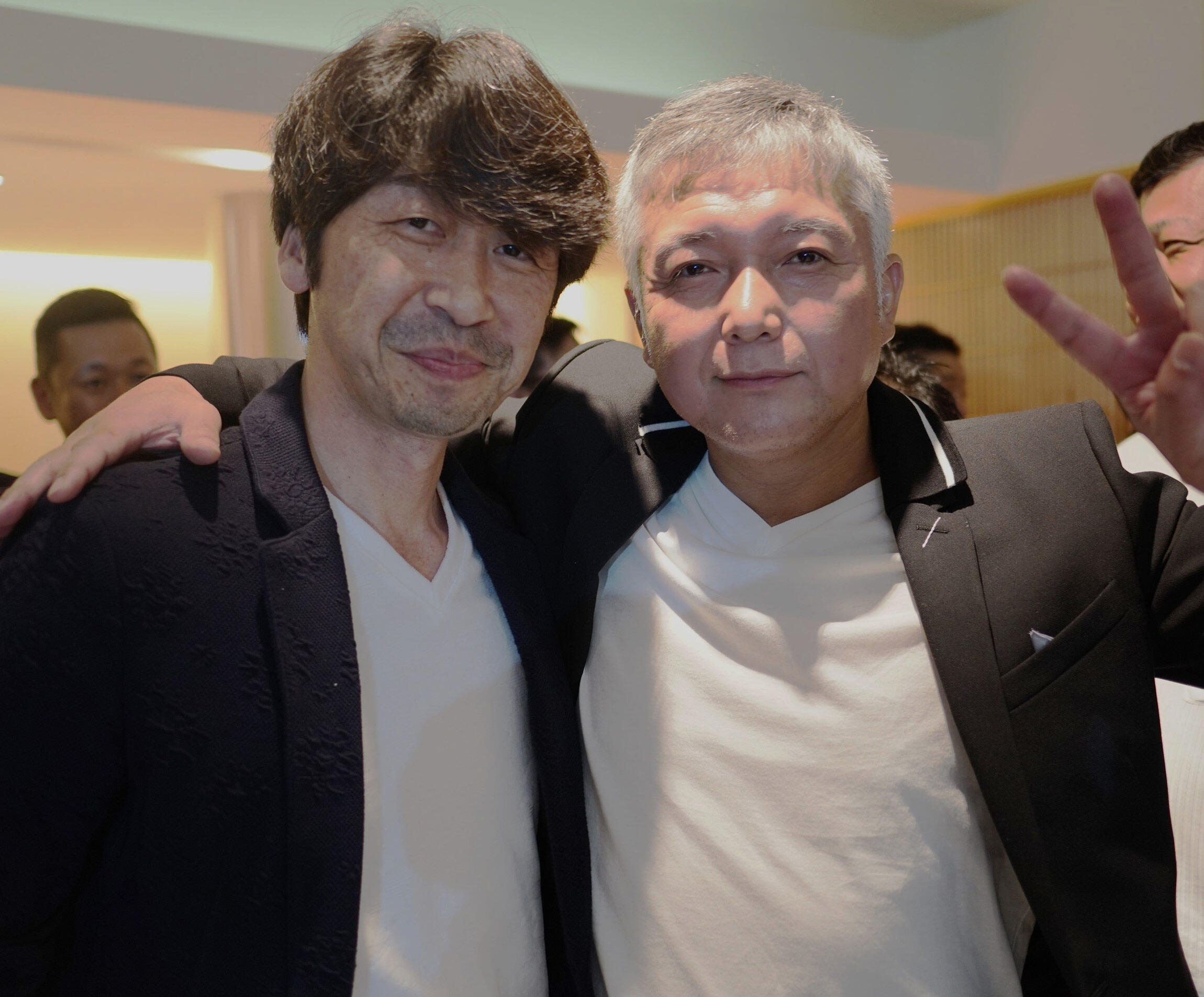 日本酒「十四代」の誕生は1994年、芋焼酎「富乃宝山」は95年。どちらも二十代の若い蔵の跡継ぎが自らの手で生み出した新しい銘柄であり、それまでになかった新感覚の味わいで、酒業界に革命をもたらしたと言われる存在だ。前回に引き続き、日本酒蔵と芋焼酎蔵、学生時代に出会った2人の跡継ぎの交流で生まれた35年の物語をお送りする。(写真は2018年、共通の取引先である福島県の酒販店「泉屋」店主・佐藤広隆さん〈連載第5回、6回で物語を紹介〉50歳のバースデーパーティーで。楽しそうに肩を組む 高木顕統〈あきつな、2023年に辰五郎を襲名、左〉と西陽一郎さん。)
