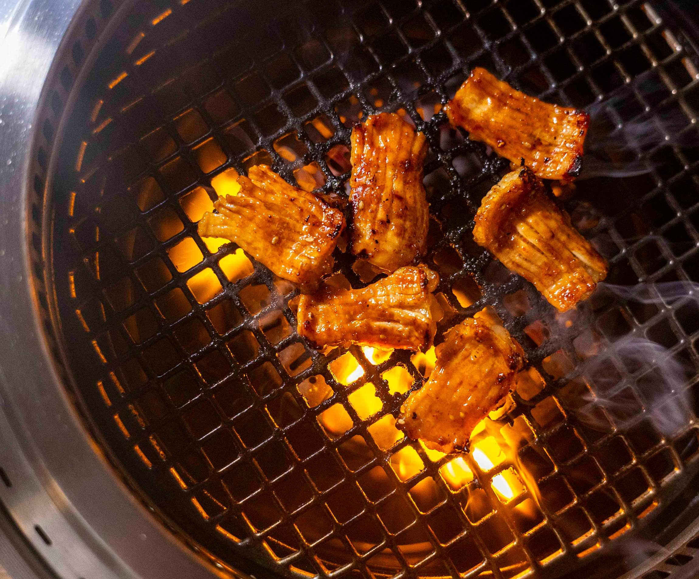 本日は早くもここで塩ハラミを網状へ。いい塩梅の厚みのハラミを網に乗せ、いじらずグッと我慢しながら待つ。接地面が反り始めたらいい焼き目がつき始めた証拠。返して反りが落ち着くまで焼いたら、心地いい破断感とジュバアッというあふれる肉汁のハラミが完成だ。