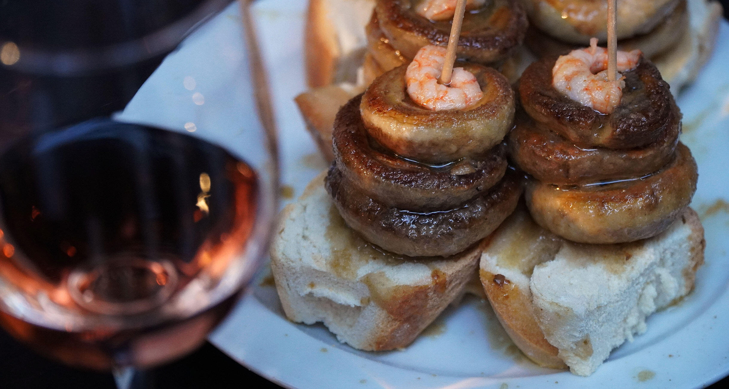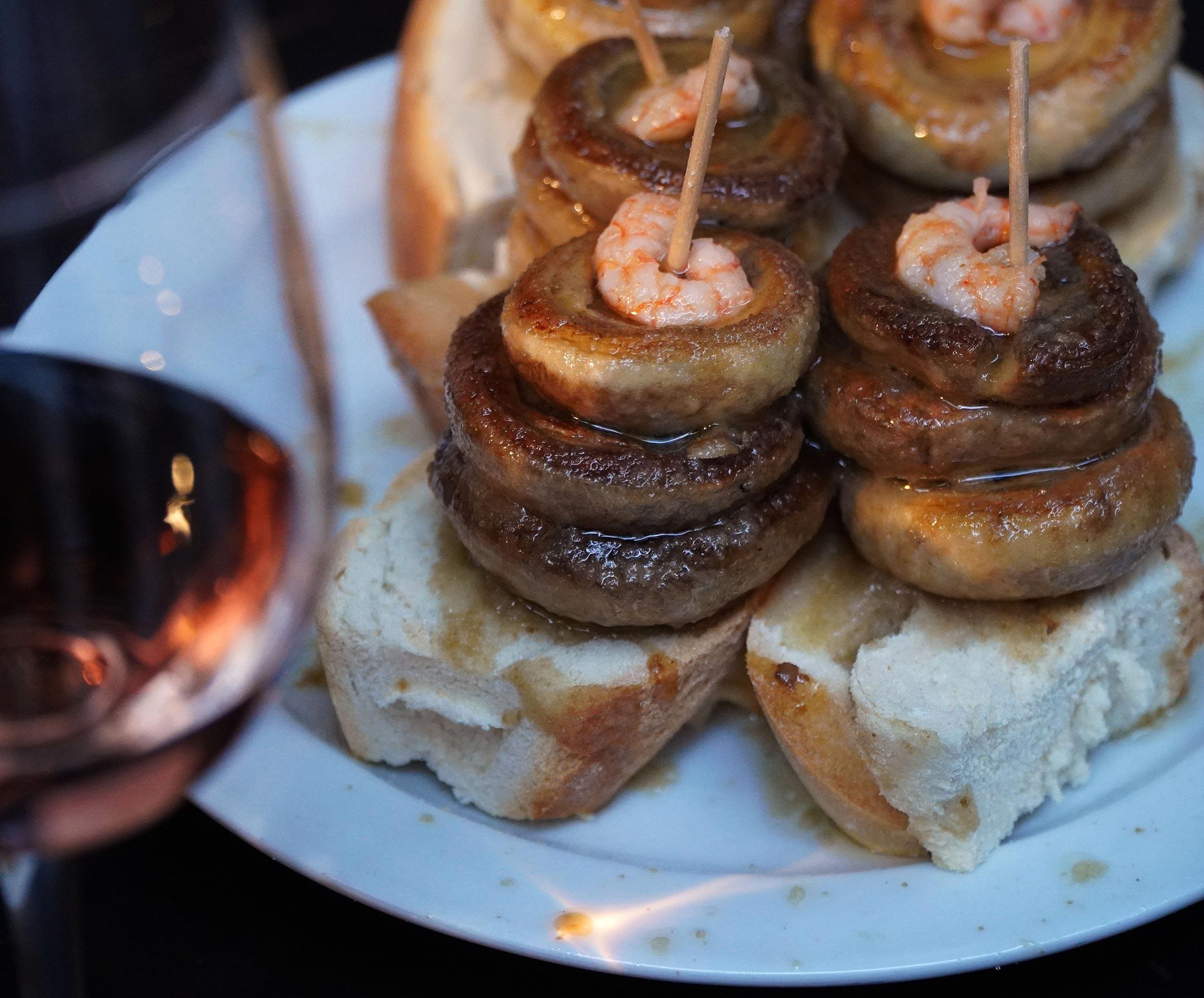 「熱いうちに食べると最高だよ」とのことで、店の外のテーブルで頬張ると、噛み込んだマッシュルームからジュースが勢いよくあふれ出た。芳ばしいガーリックオイルと、エビの旨味エキスが絡んで恍惚となり、下で支えているフッカフカのパンに、ガーリックオイルがジュワリと沁み込んでいく。これがたまらなく旨いのだ。組み合わせ自体は正直言って何てこたぁないのだが、このピンポイントの焼き具合と、滴るほどのガーリックオイルの量と、旨味が濃いエビと、パンの厚みとフッカフカ具合が完璧なのだろう。これ以上でも、これ以下でもない、50年以上愛されているというのも頷ける味わい。隣のテーブルで飲んでいた元サッカースペイン代表イニエスタ似のおじさんが「ナンバーワン・イン・ザ・ワールド・マッシュルーム!」とカタコトの英語でなぜか誇らしげにサムズアップしてきたが、確かに世界一だ。間違いない。説得力が違う。