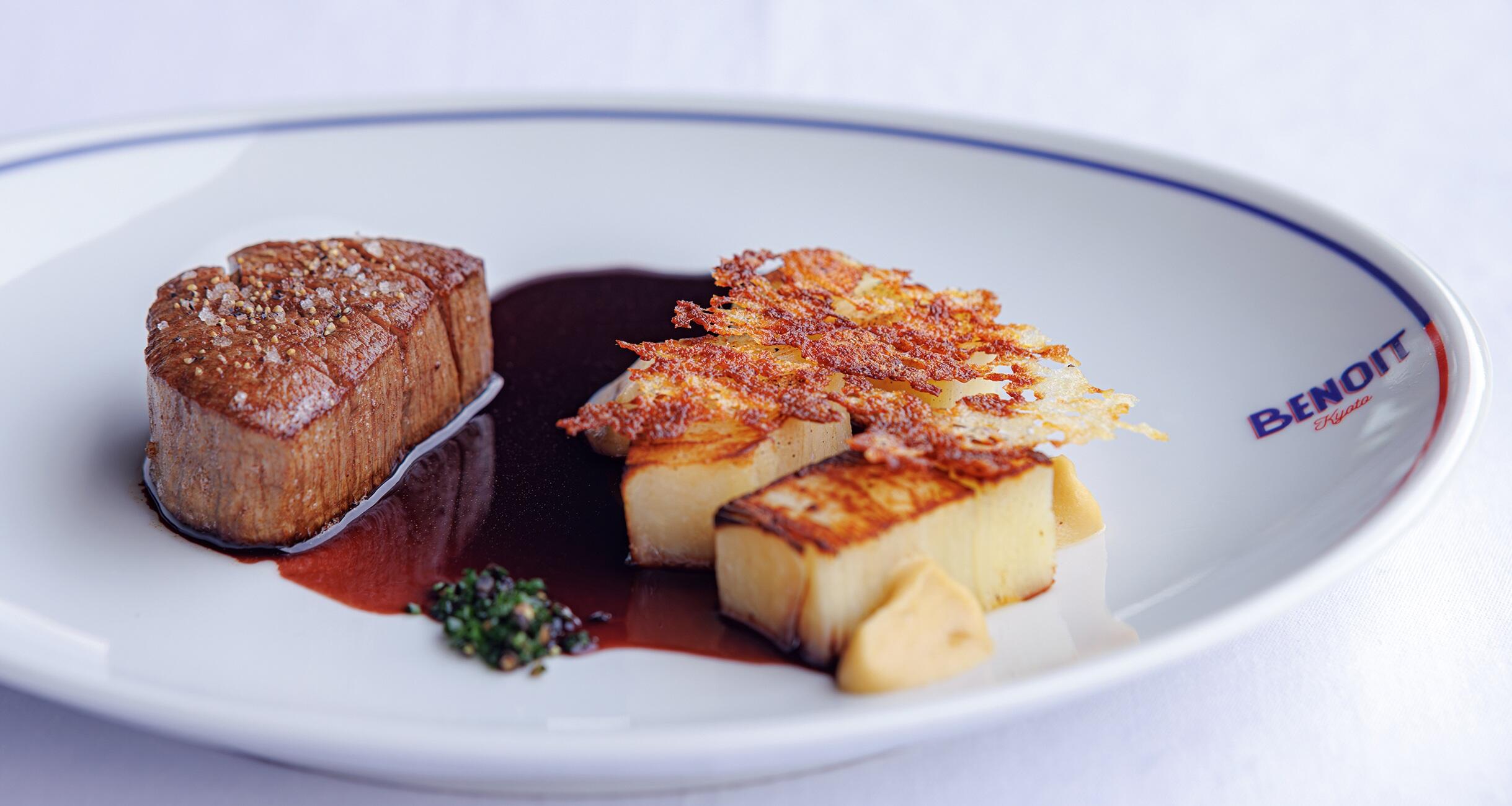 今もなおパリで愛される1912年創業の老舗ビストロ「ブノワ」は、現在フランス料理界を牽引するアラン・デュカスがその名とエスプリを受け継ぎ、日本でもフランス各地方の伝統料理を礎にしながら現代の感覚で軽やかに表現している。京都・東山の高台に佇む「ブノワ 京都」では、京都産を中心に日本各地の食材を取り入れ、アラン・デュカスの料理哲学に基づく素材の持ち味を明快に引き出した料理を提供。昼、夜ともプリフィックススタイルのコースで、ビストロメニューを存分に楽しめる。特筆すべきは、窓いっぱいに八坂の塔を望むロケーションと明るく開放的なダイニング空間。陽光が差し込むランチタイムには東山の景色が一層身近に感じられ、春からはテラス席も用意される。京都という土地ならではの高揚感と上質な日常のフランス料理。双方を心ゆくまで堪能できる。