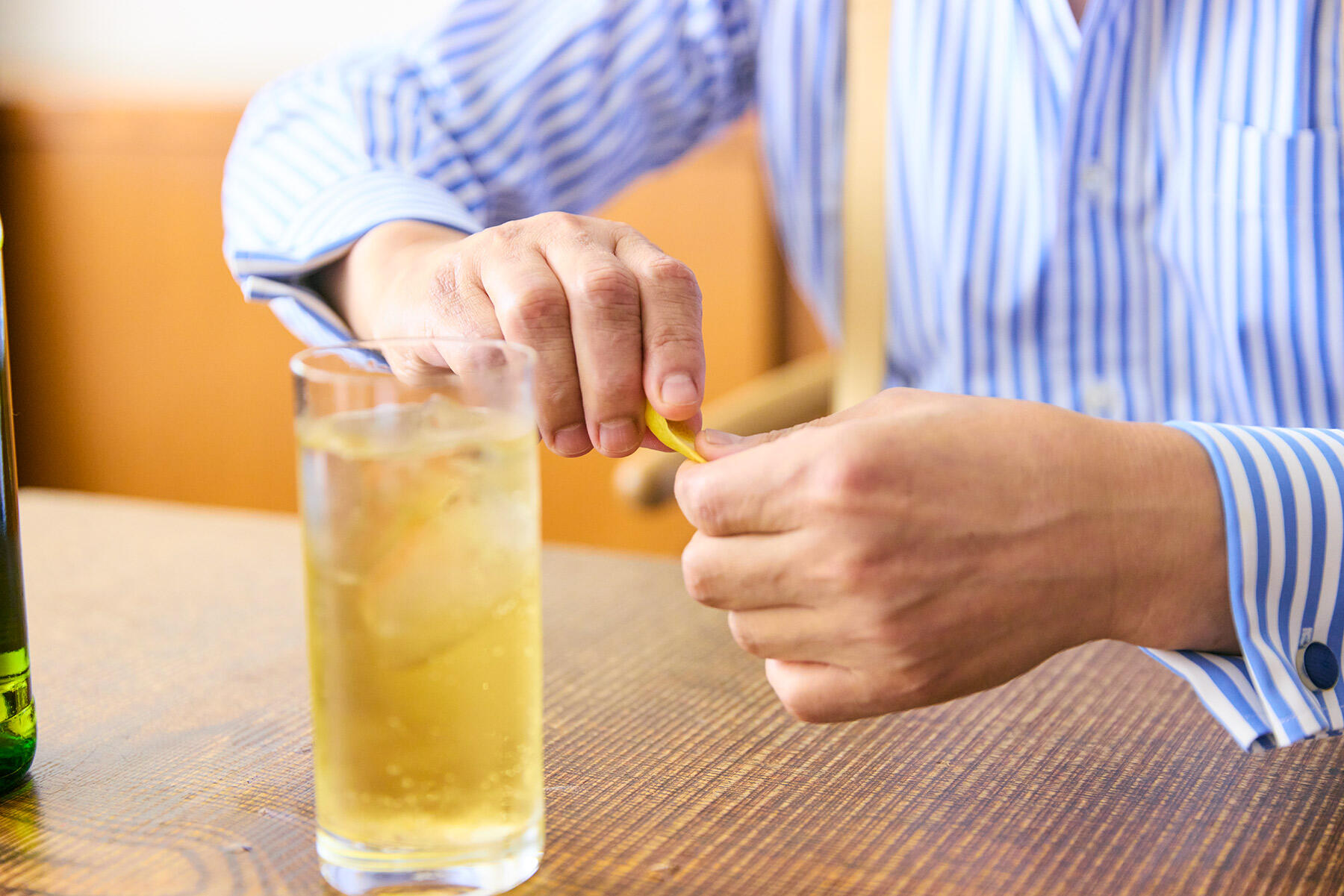 「ウイスキーにソーダを注いだ後で、レモンピールをしているんですよ。グラスの縁の横でレモンの皮を搾って香りをつけます。グラスの上で搾ると、レモンの皮から出る霧状のしずくがお酒の中に入ってしまいますね。皮から出るしずくは苦いのですが、それが、ウイスキーの苦味を引き出してしまう。だから、そのしずくはグラスに入れず、グラスの横で搾ることで、香りだけをつけるわけです」