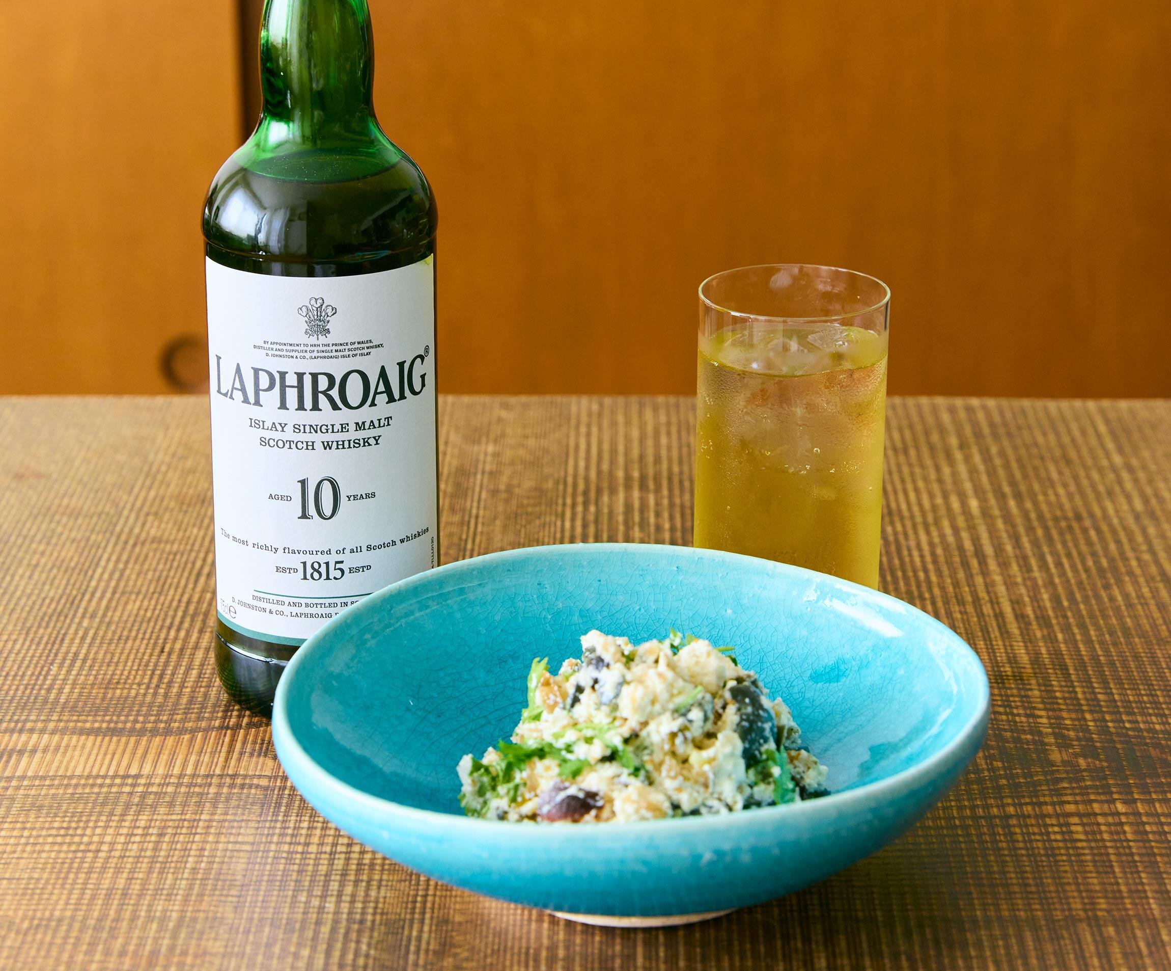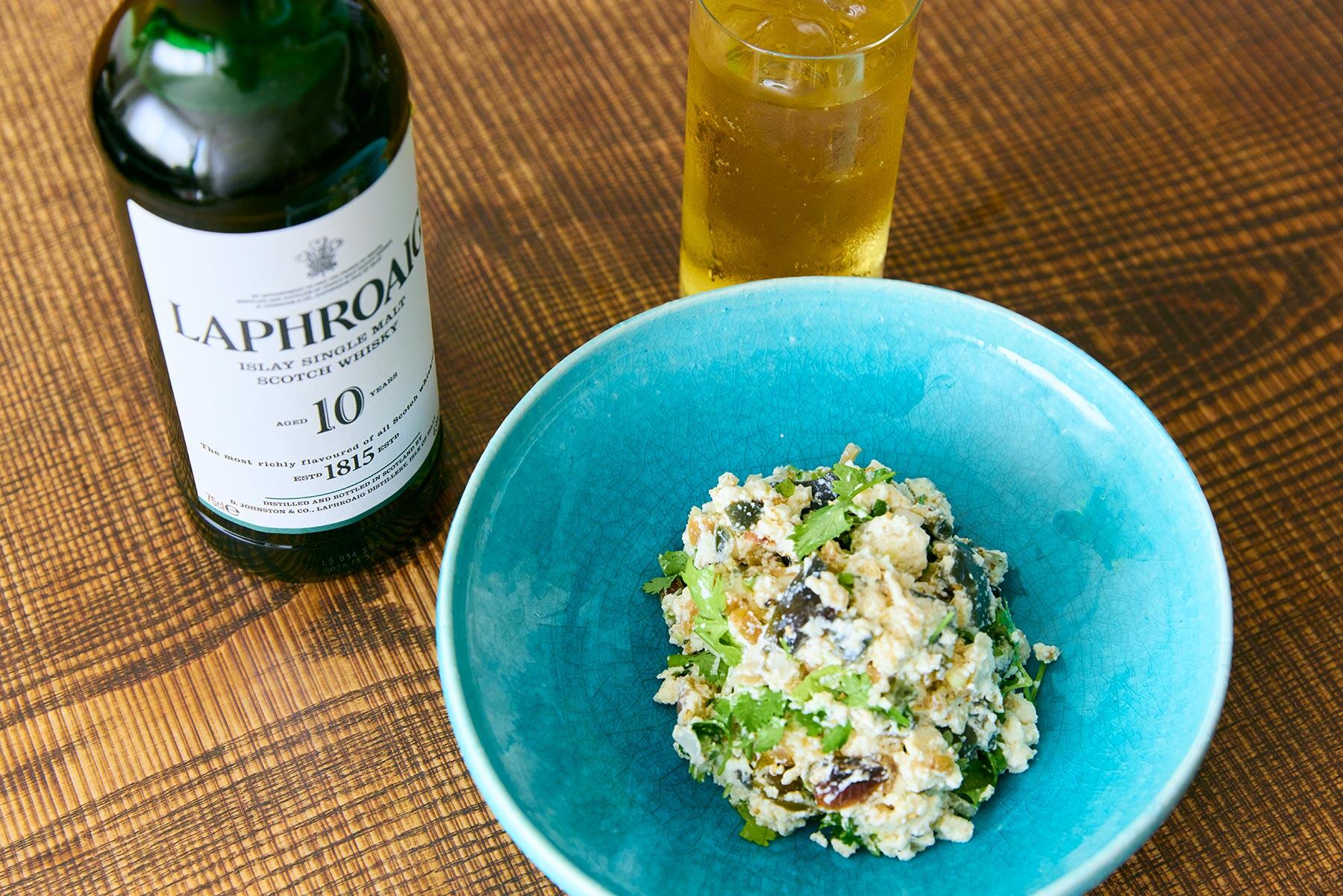ふくよかな味わい深い白和えに、レモンがかすかに香るラフロイグのハイボール。酒もつまみも、両方お代わりしたくなるはずだ。