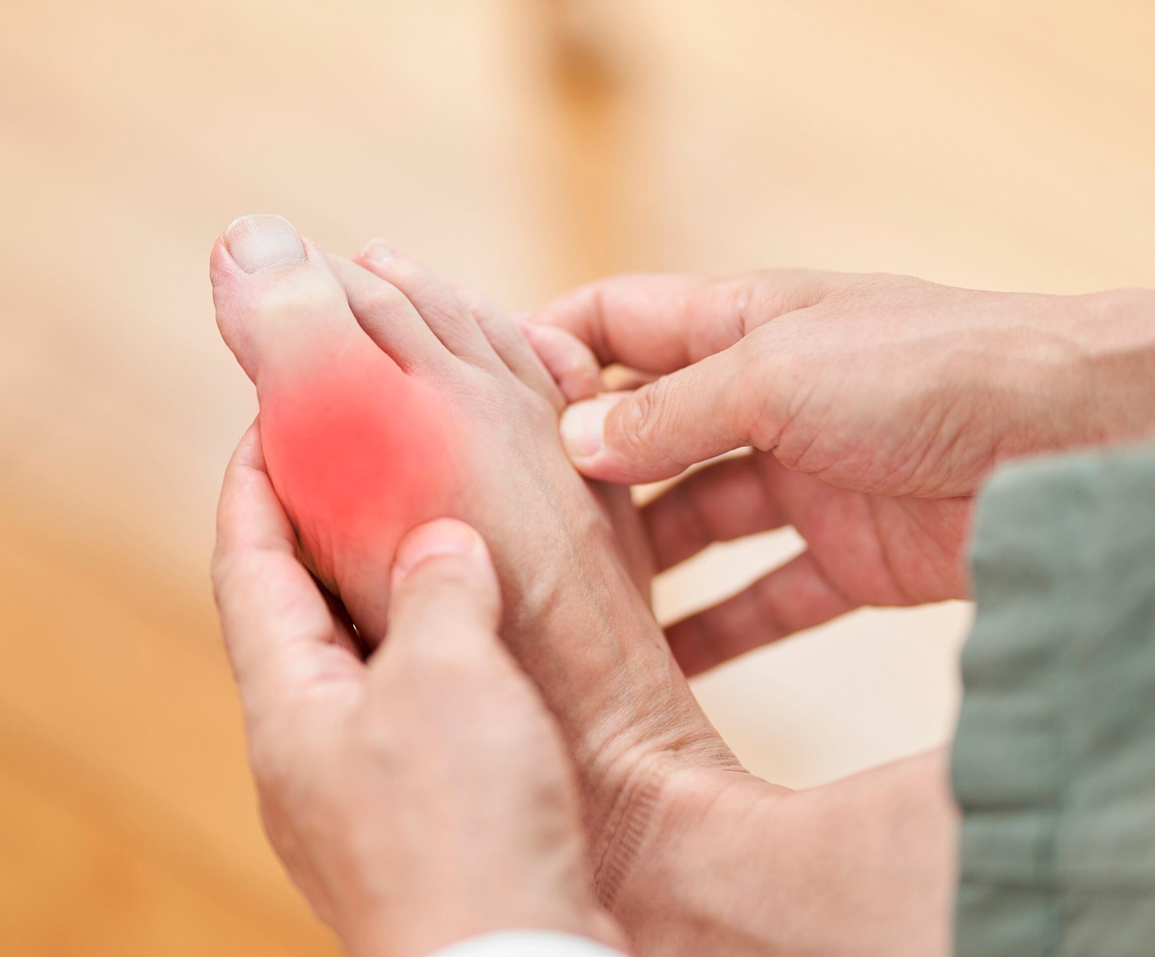 尿酸というのは、細胞の新陳代謝の際に発生するプリン体が、肝臓で分解されてできる老廃物のことで、通常は水に溶けて尿や便で排出されます。健康な人は、尿酸がつくられる量と排出される量のバランスがとれているのですが、尿酸がつくられすぎたり、うまく排出されなかったりして過剰になり、それが結晶化して、関節などの組織にたまると激しい痛みを伴う炎症を起こします。これがいわゆる痛風です。多くの場合、足の親指のつけ根が赤く腫れて熱を持ち、強い痛みが出ます。この発作は24時間ほどでピークに達し、1〜2週間で自然に治まります。