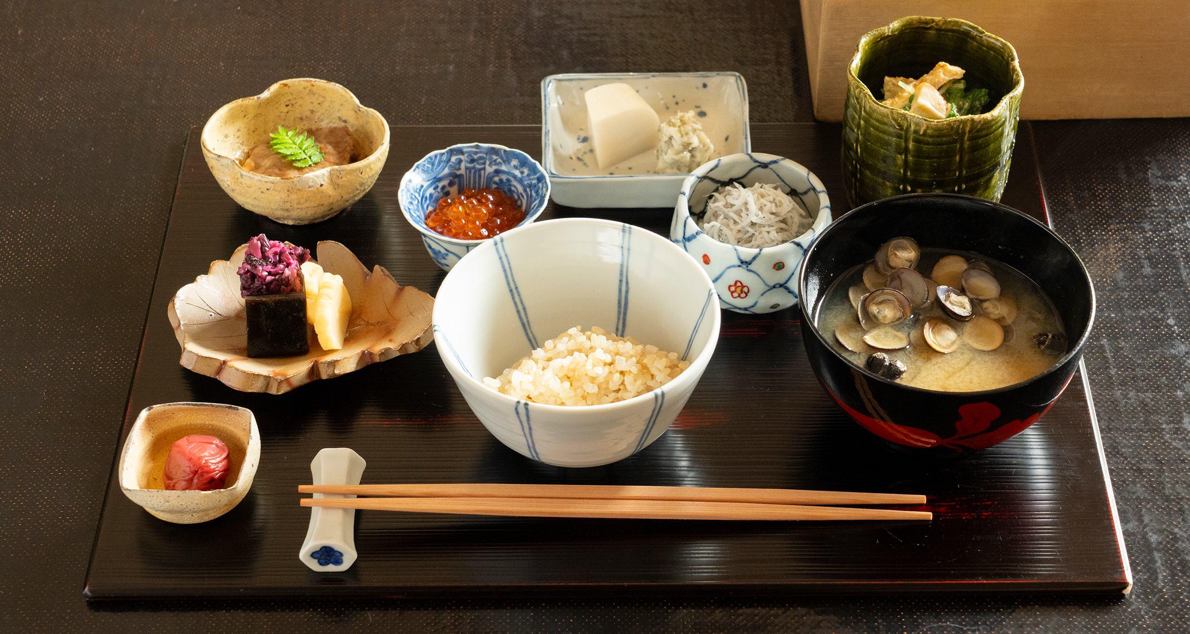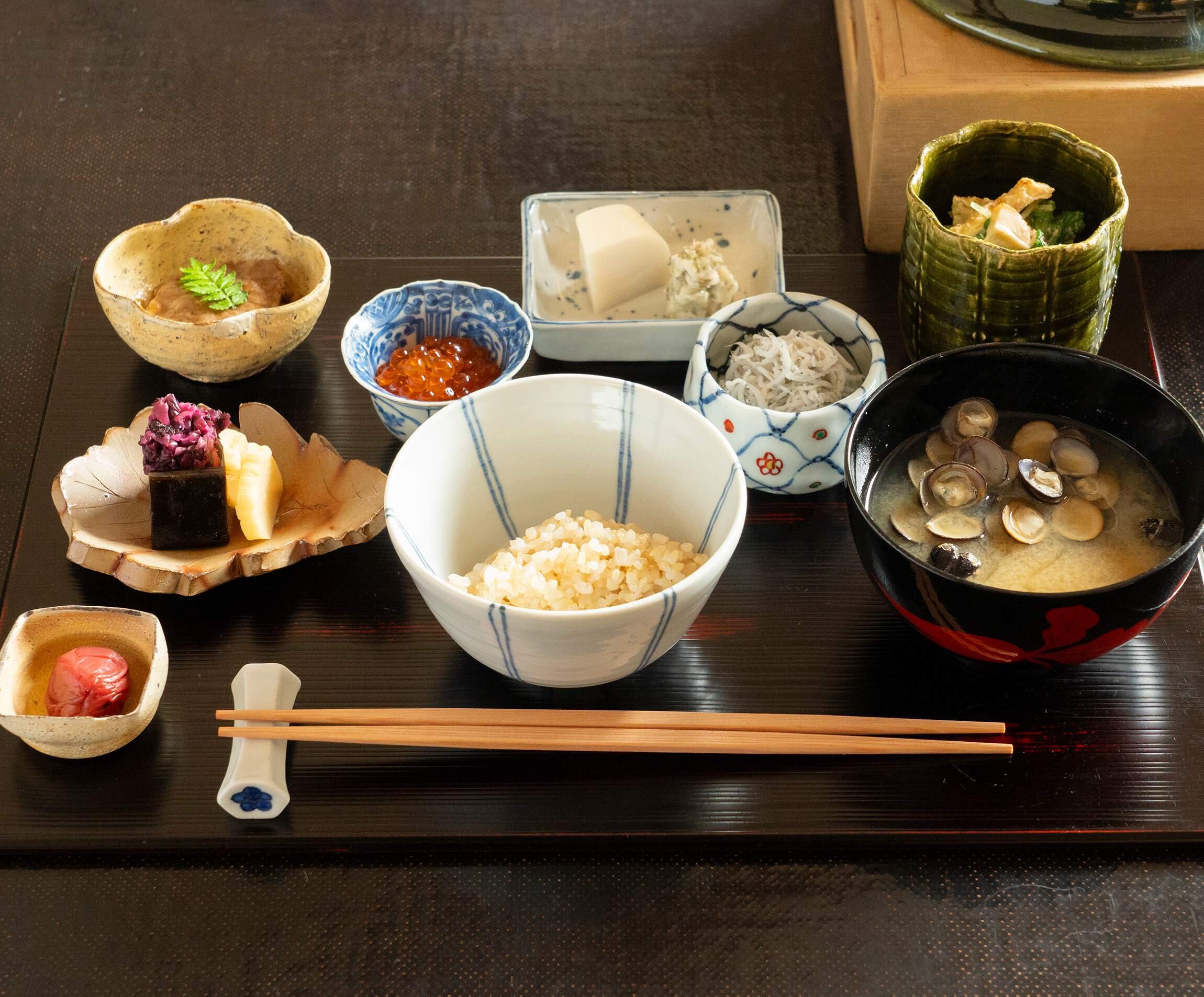 だし巻きは地元の山惠園という養鶏場のたまごを使用し、鰹だしによる香りと旨味が朝の胃袋に心地よい。焼き物は地元の真鶴や伊豆、伊東で獲れる旬な魚を地元の鮮魚店で干物にしてもらい、食べやすいように骨は一切残していない。炊き合わせはひろすと大根。地元の人気豆腐店「十二庵」の豆腐を使用したひろすは、煮干しのだしで味の輪郭をはっきりさせている。