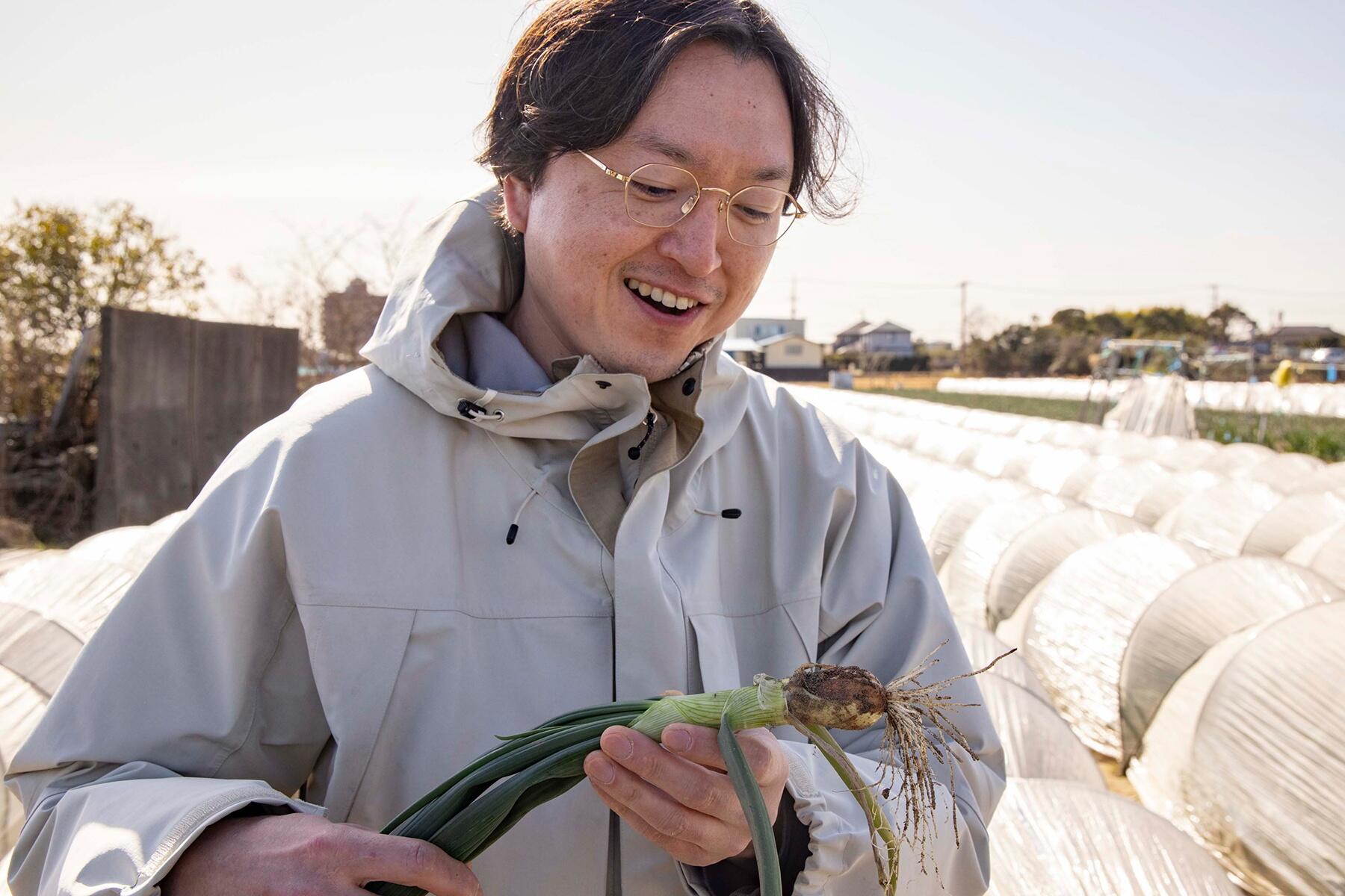 同じ長生郡の白子町にある“ながいき葉たまねぎ”の生産者、長島圭一さんと、“長生(ながいき)葉にんにく”の生産者、三橋利久さんの畑も見学した。葉たまねぎも葉にんにくも球根が大きくなる前に早採りして、青い葉を味わう早春の葉野菜だ。