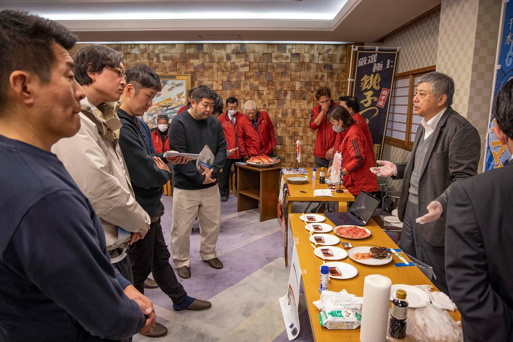 マカジキでは「サンマを餌にするから脂ののりがよく、ピークの時季は全身が中トロになります」との説明にシェフたちは熱心に耳を傾けた。