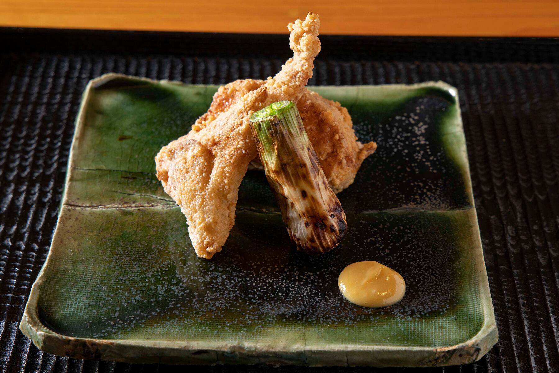 もちろん、イレギュラーなその旨さも食材を生かす技術があってこそ。トラフグは活けで送ってもらい、自ら締めて身欠きにしたそうだ。添えられた柚子味噌をつければ唐揚げに気品が加わり、あしらいの葉たまねぎを丁寧に炭火焼きするところも心憎い。
