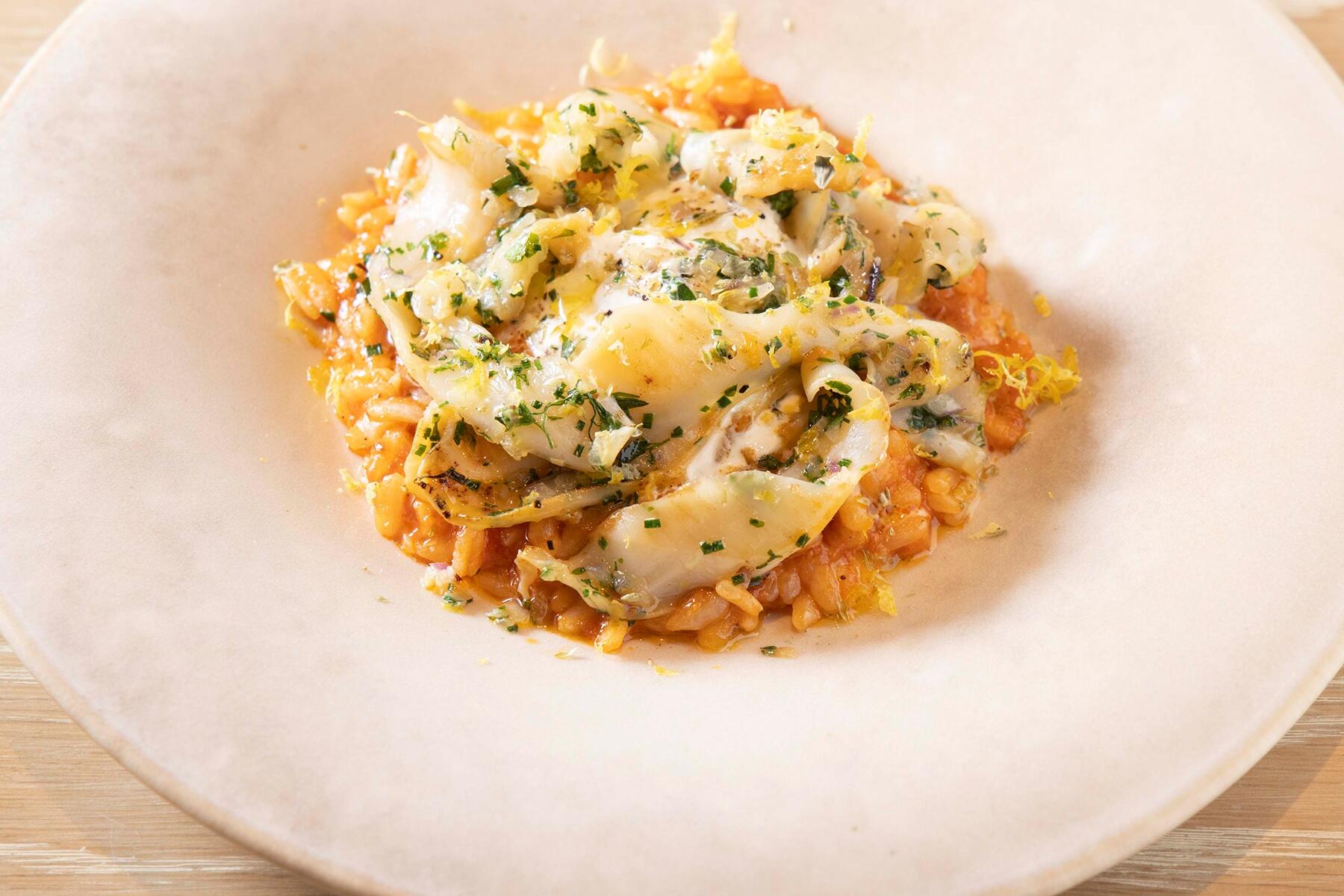 そこでアラカルトの一品として考案されたのがリゾット。といっても、米と一緒に煮込まず、エシャロットなどと強火でさっとソテーしてトッピングする。これにより一口ごと瑞々しい甘味と歯切れのいい食感を満喫できるというわけだ。