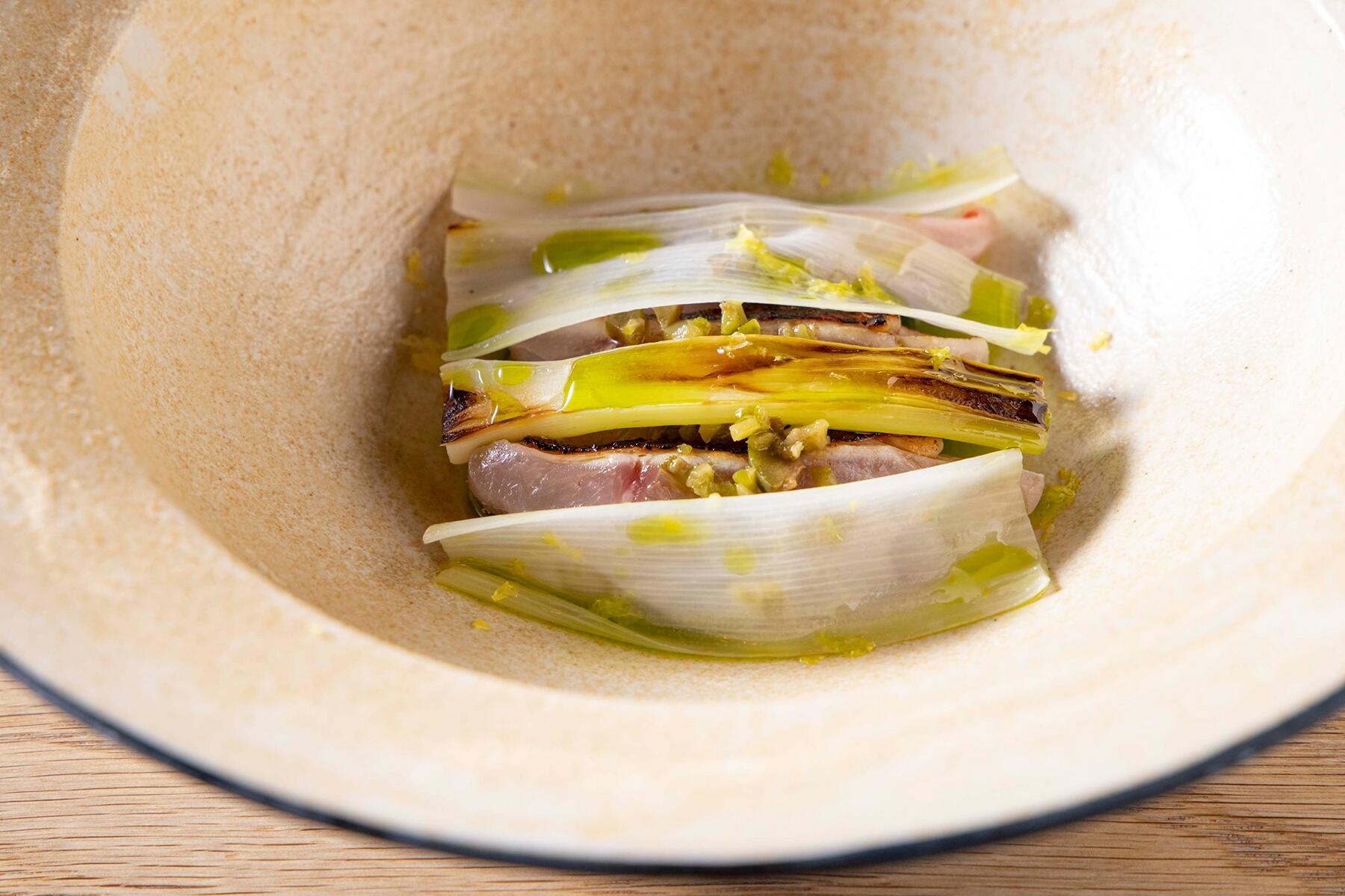 トラフグは身欠きを仕入れ、薄い衣でクリスピーなフリットに。スパイス香るパプリカソースが添えられる。その横に並ぶのは、アクアパッツァさながらに蒸し焼きにした葉たまねぎ。「豪華なダブルキャストです」という言葉を聞いたらオーダーせずにいられない。