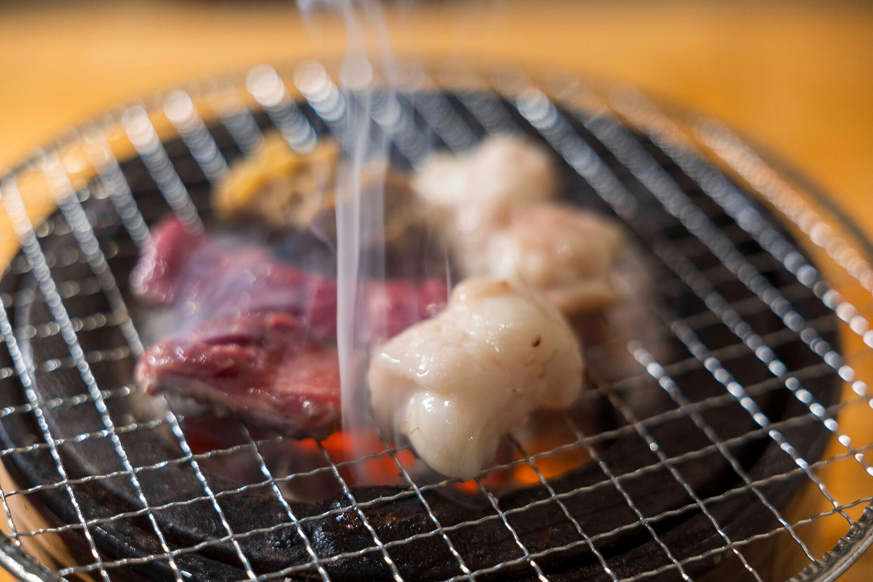 みっちりした赤身の厚切りハラミを炭火でじっくり炙る。表面がざらりとした頃に喰めば繊維がぶつりと弾け、赤身のミネラルがあふれてくる。炭火から煙と香りが立ち上り、噛めば肉汁の泉湧く。そんな喜びが沼袋「塩ホルモン・赤身肉 太陽」の店内には充満している。