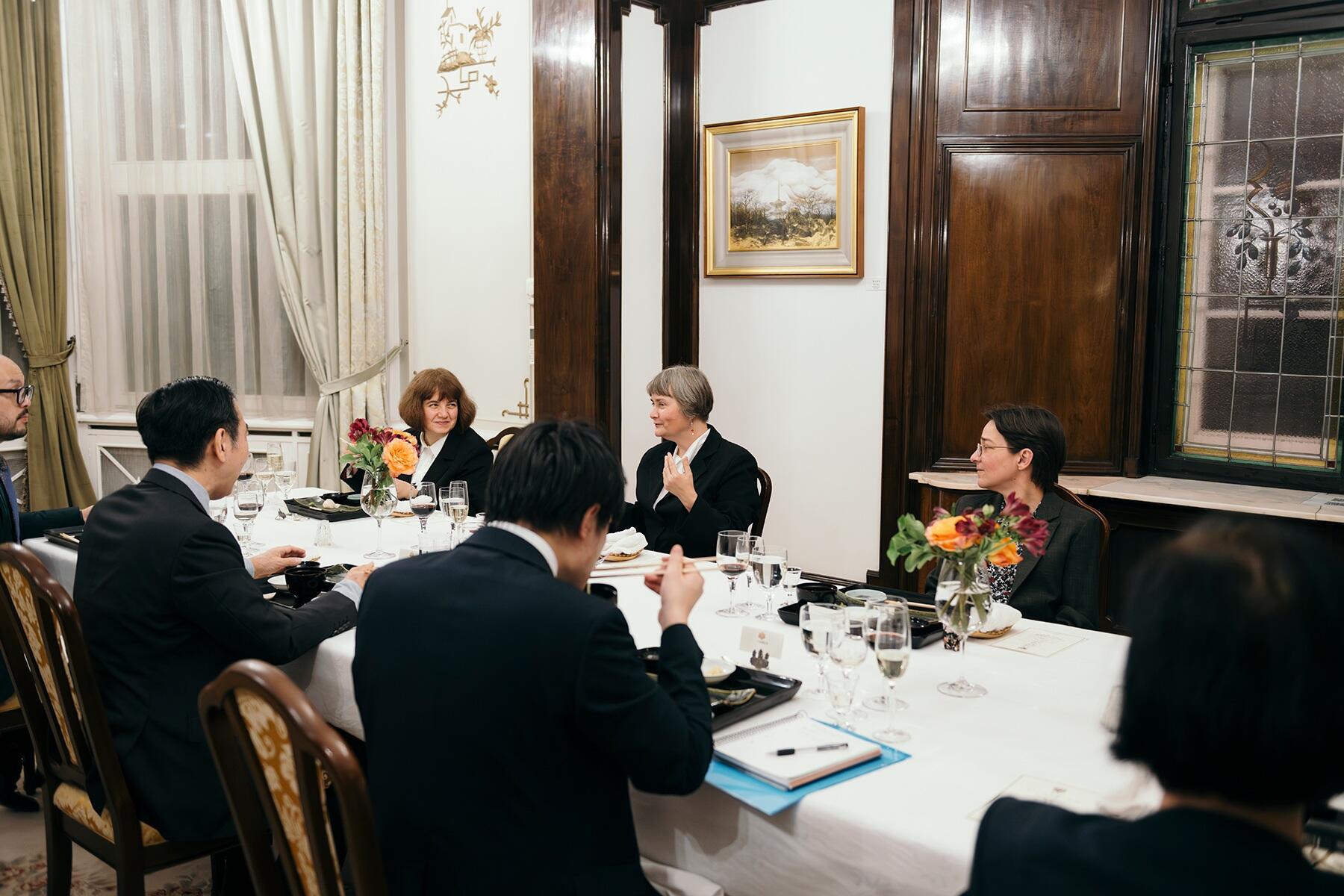 さあ、いよいよ会食がスタート。片江大使が玄関でゲストを迎え入れ、まずはサロンで談笑。頃合いを見て、ダイニングの扉が開きます。