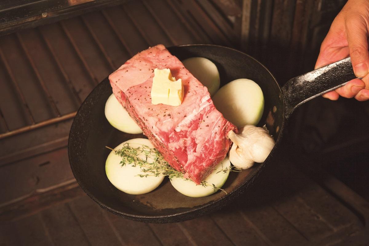 繊維に垂直に薄く切り出し、一緒に焼いた玉ねぎ、にんにくとともに盛り付ける。