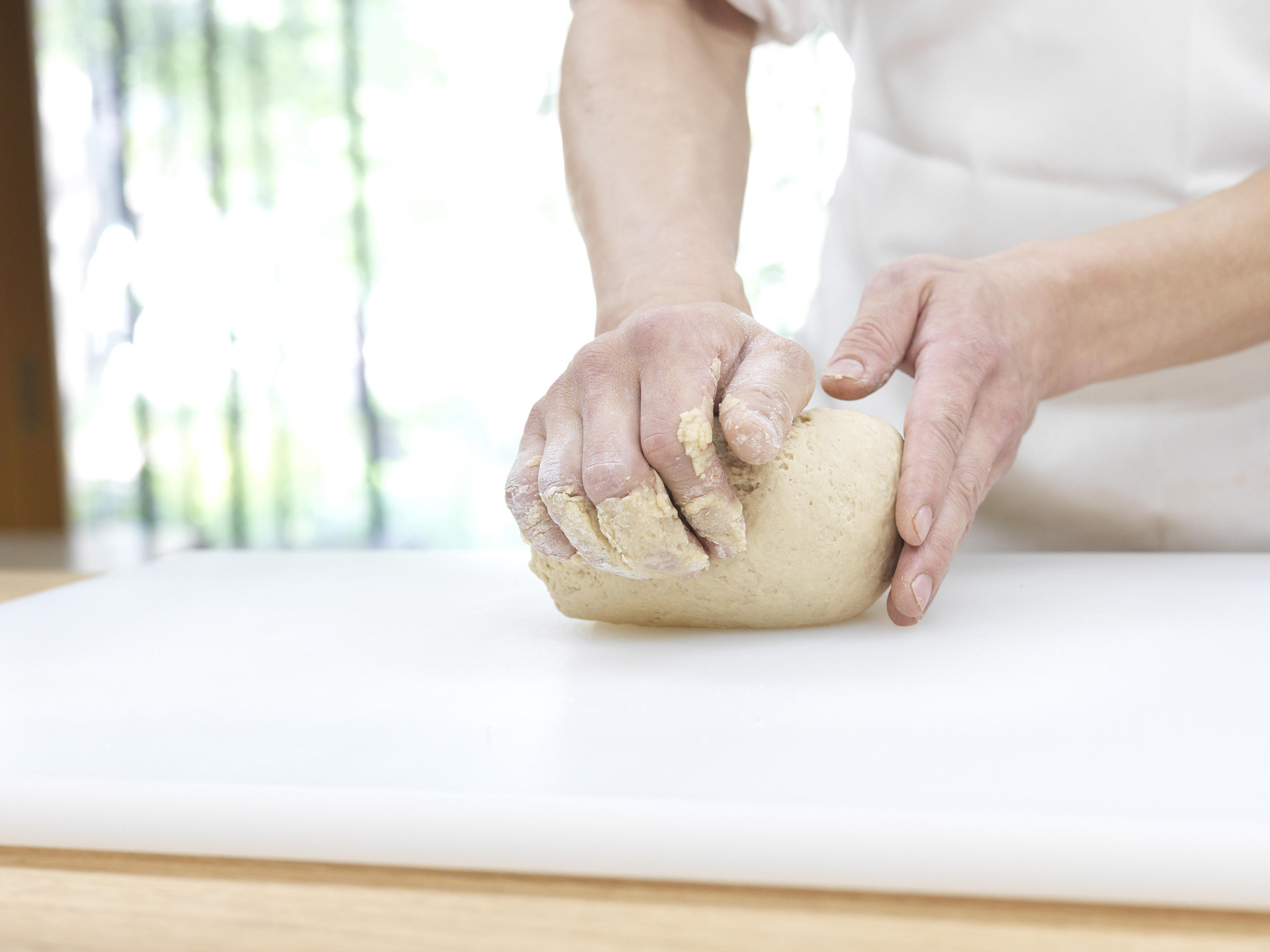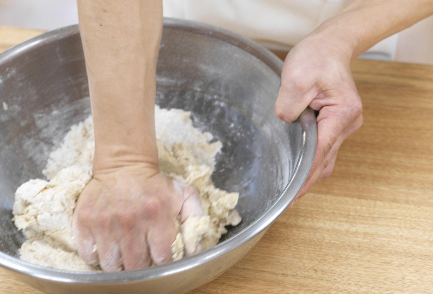 材料がひとつにまとまったら、まな板に移してこねる。手首の部分を使って生地の真ん中を押し出すように。生地が滑らかになってきたら、グルテンが出てきた証拠。