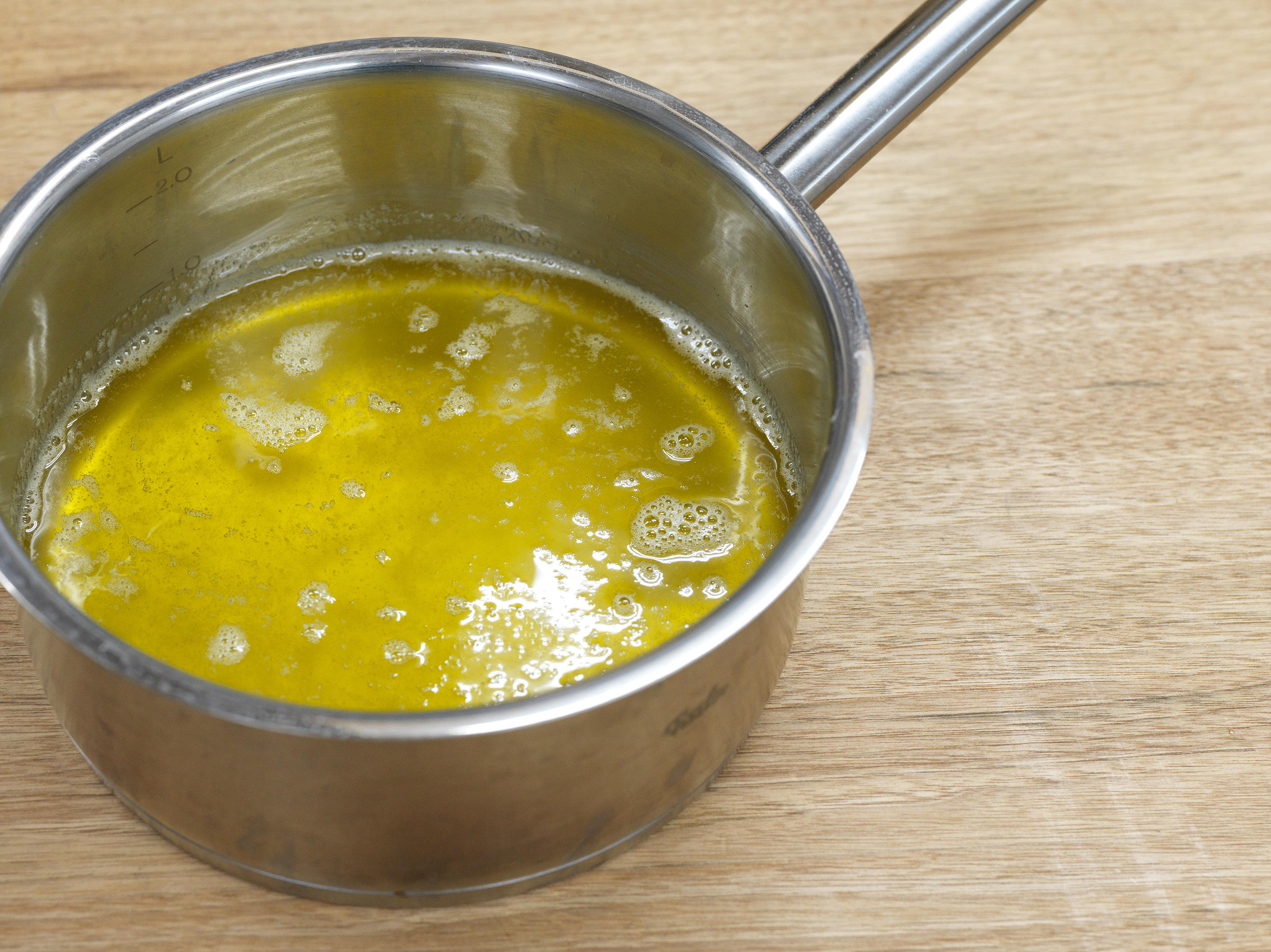 オーブンで生地を焼いている間に、浸し用のバターを用意する。中火にかけた鍋で発酵バター(浸し用)を加熱し、泡立ちはじめたら、別の鍋に漉しながら移す。