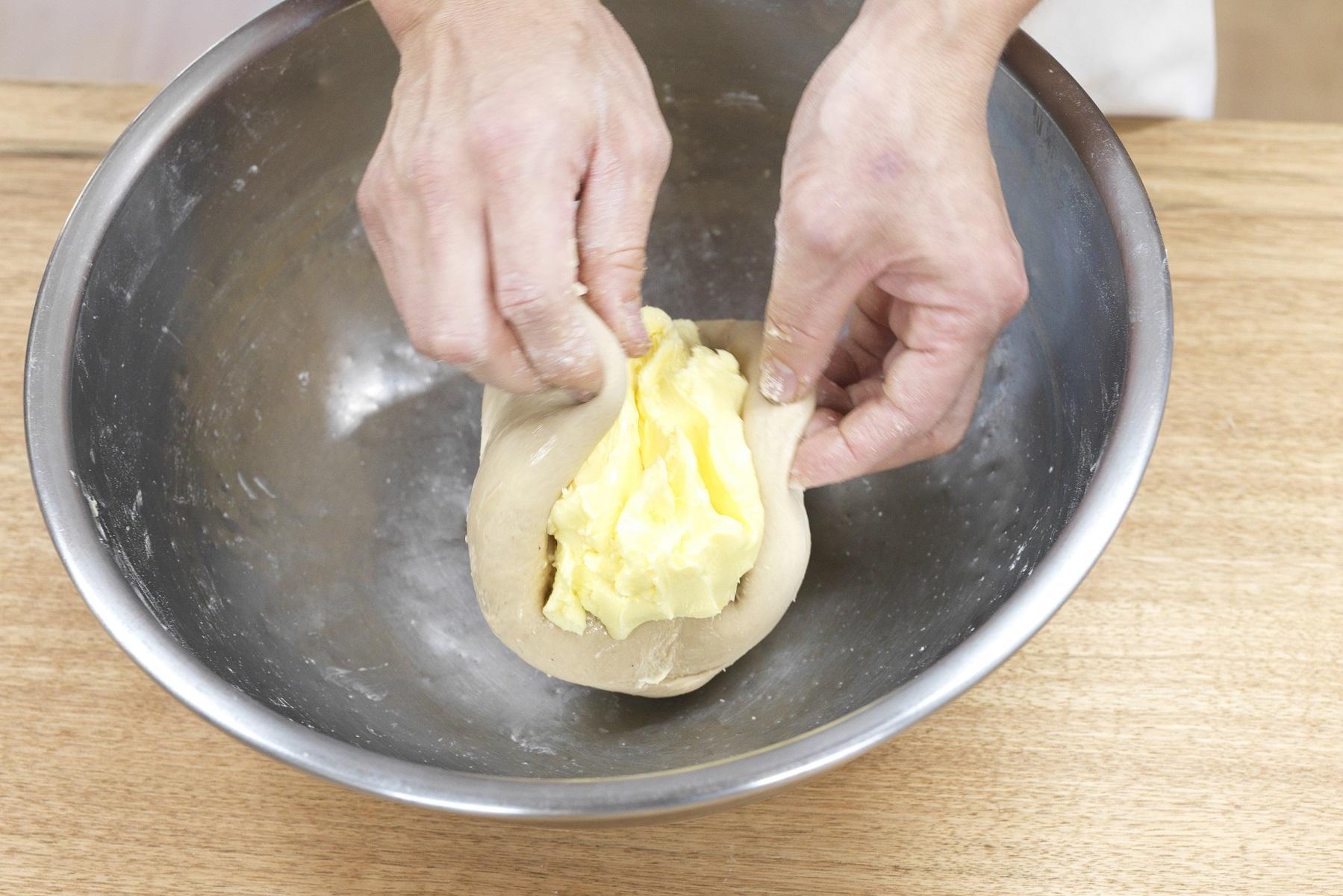 生地の表面にツヤが出てきて、手にくっついてこなくなったら、生地で無塩バターを包むようにして練り込む。