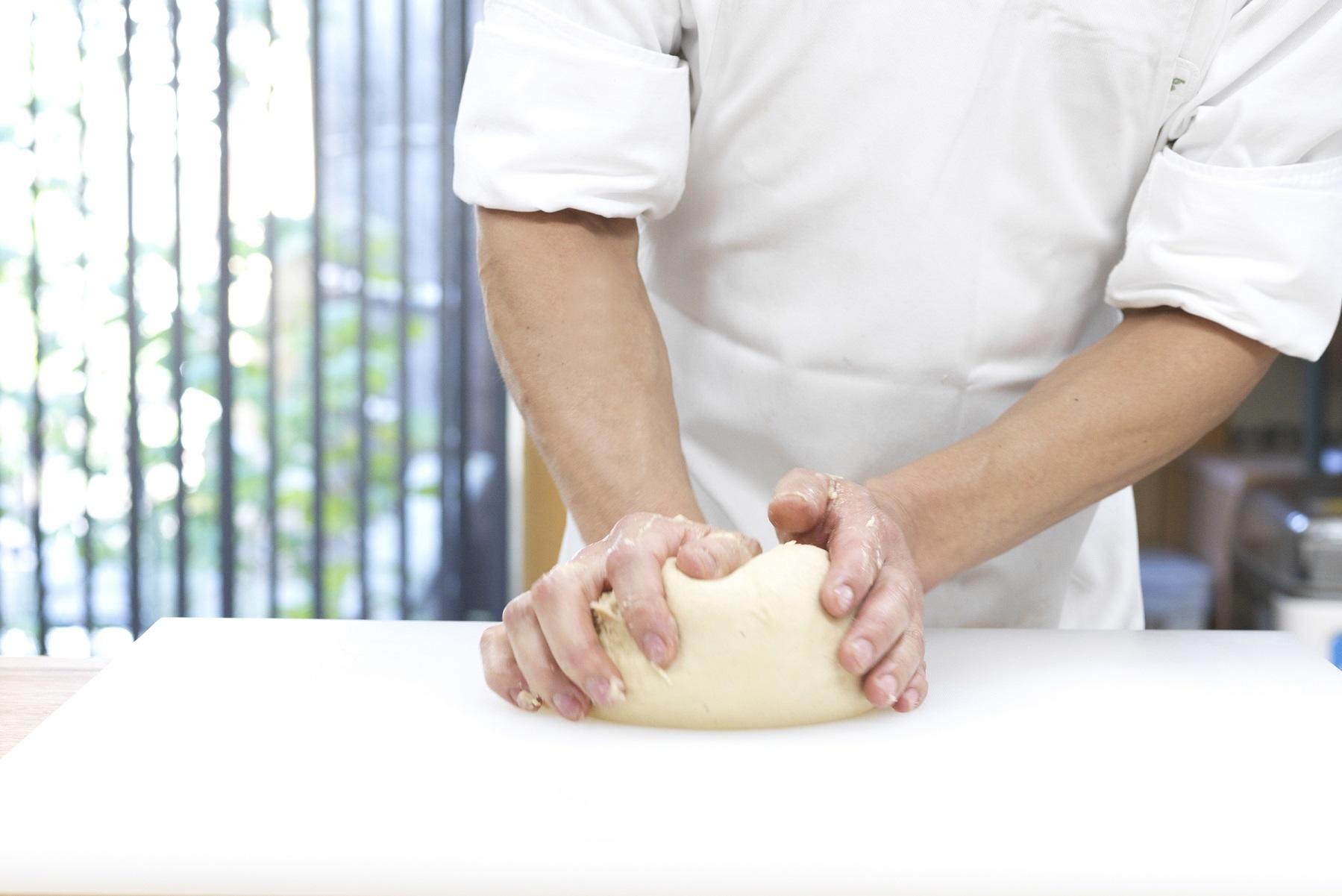蕎麦打ちの〝菊練り″というやり方と同じで、外側から内側に生地を巻き込んでいく。そうすると生地に菊のような模様が出てくるんです。