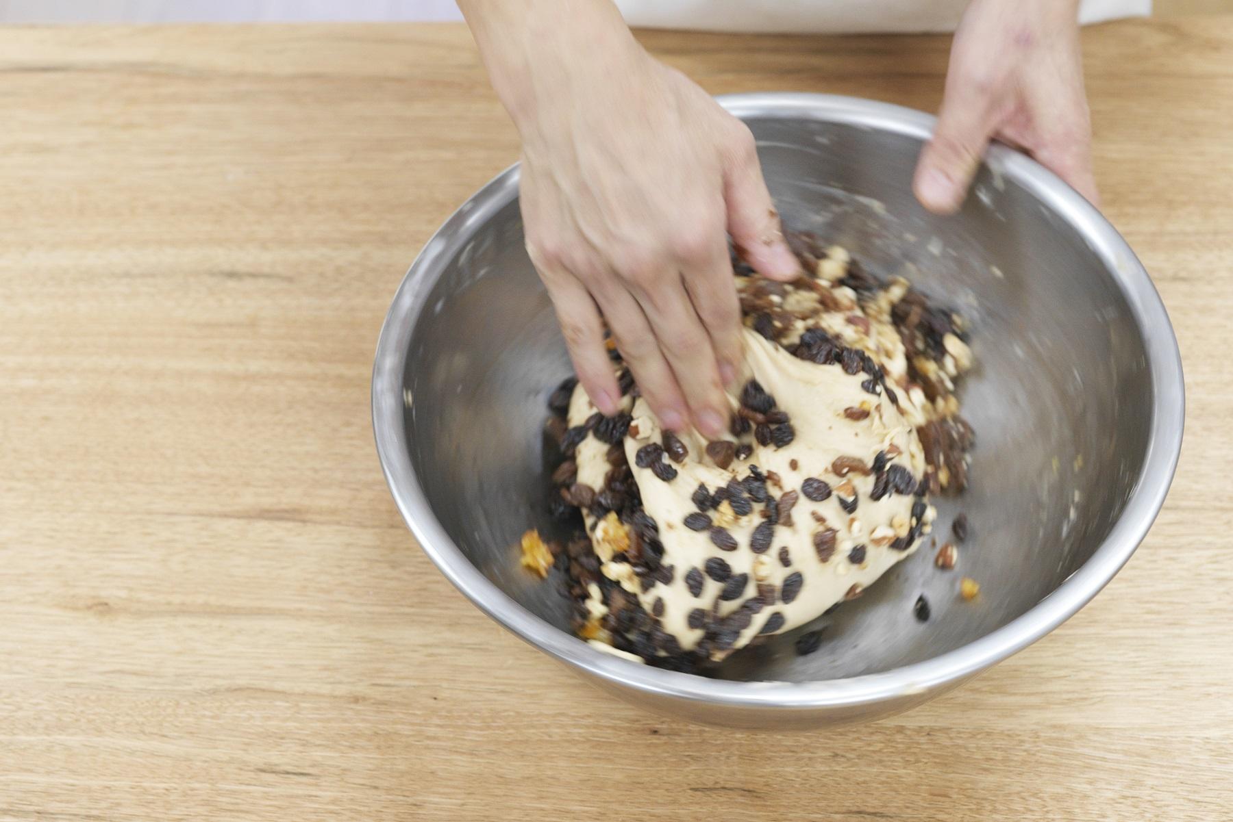 生地を押し付けるように混ぜると、ラム酒漬けのシロップが生地に染み込んで、発酵の邪魔をしてしまいます。フルーツが固まらないように混ぜるぐらいで大丈夫です。