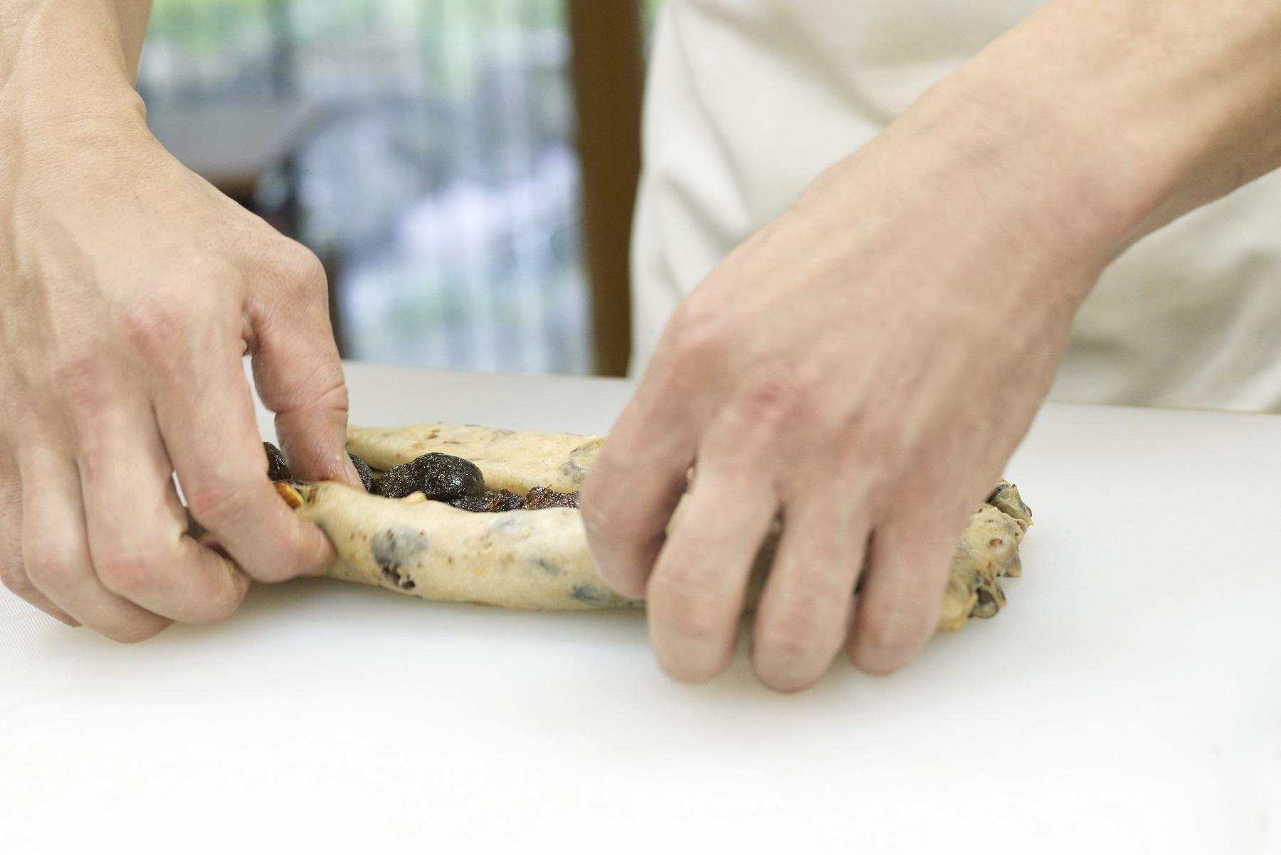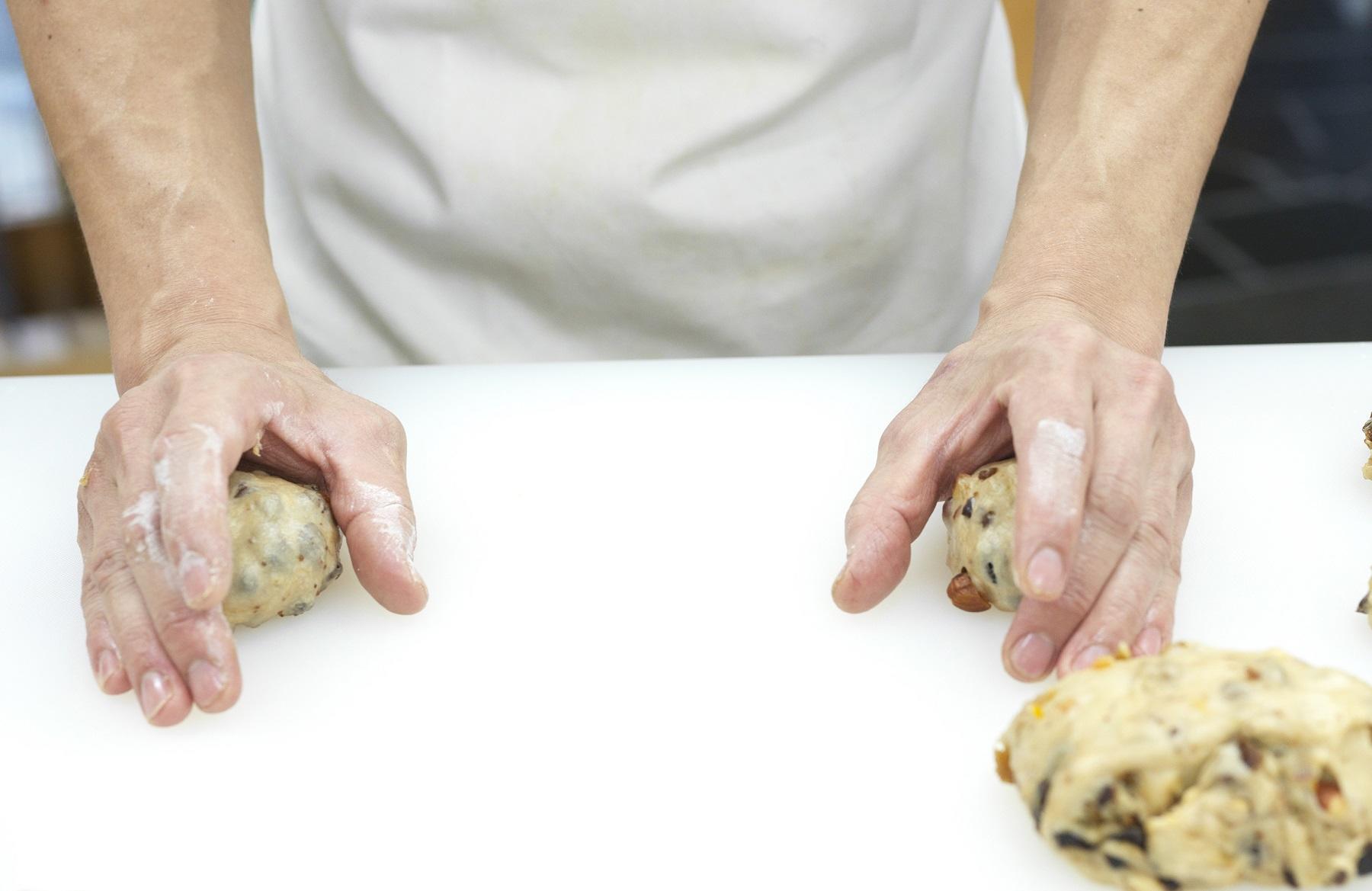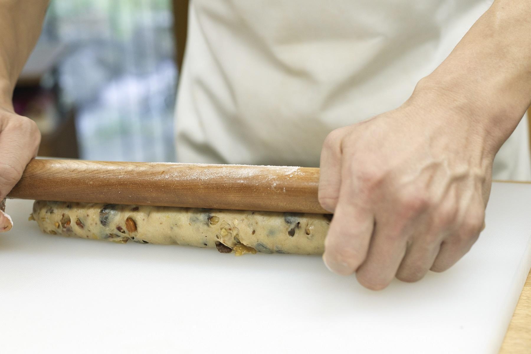 バターを手で直接触ると溶けてしまうから、生地で包み込むようにして、練りこむんですよ。