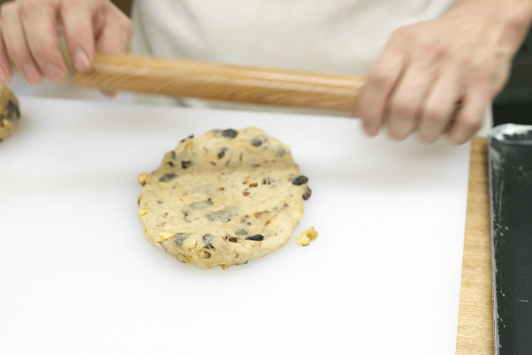 めん棒で両脇を押し込み、天板に並べる。180度に予熱したオーブンで、35分焼く。