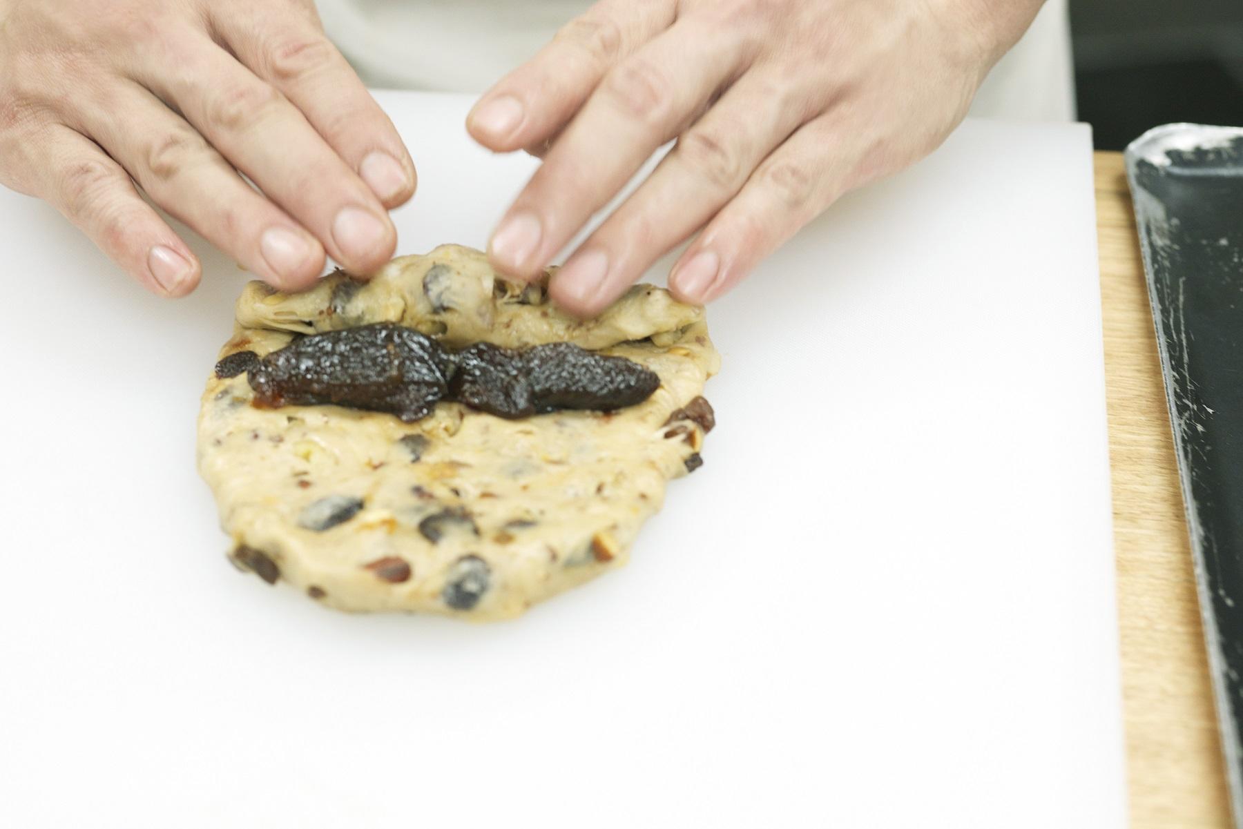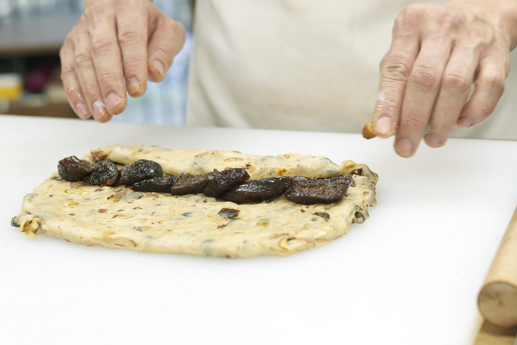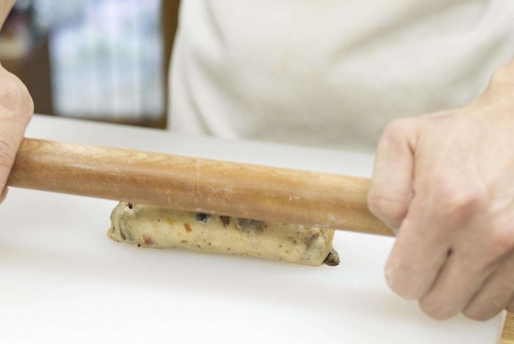 中サイズの生地は打ち粉をつけためん棒で小判形に延ばし、いちじくのコンポートを中心に並べる。下半分の生地を中心まで巻き込む。