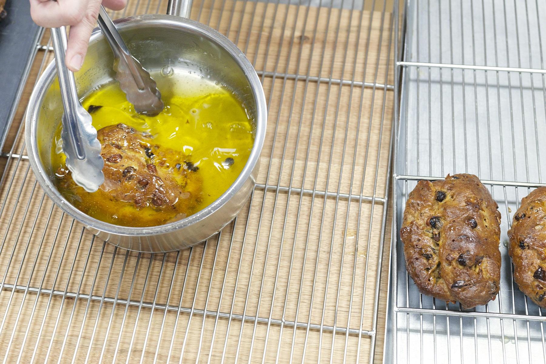 バターを80度に温め、生地にたっぷりと染み込ませていく。