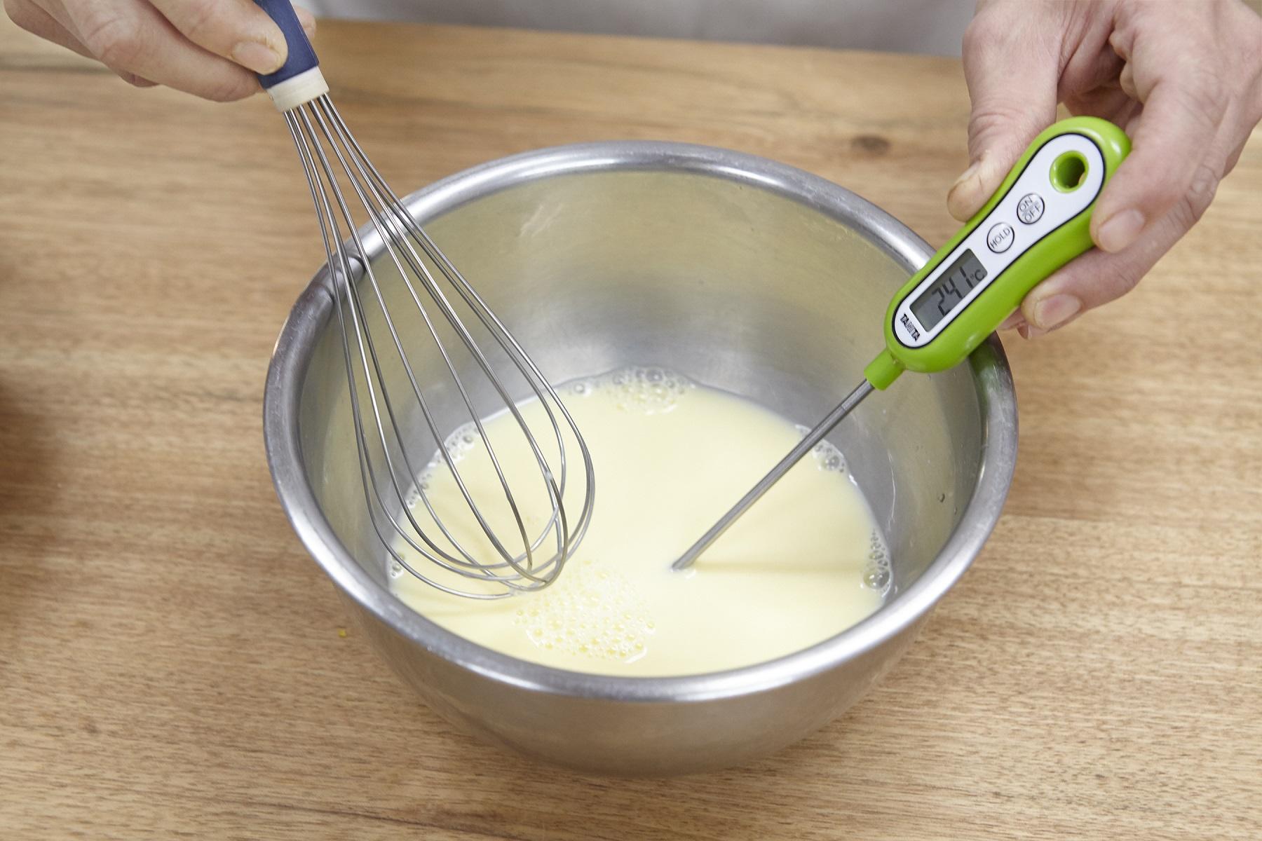 ボウルに卵と牛乳、ぬるま湯を入れて、ホイッパーで混ぜる。芯温計で温度が23度から25度であるか確認する。