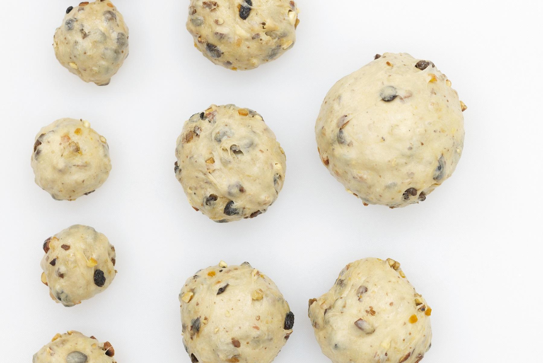 80g の生地は、手で覆うように丸めて天板へ。180度に予熱したオーブンで、35分焼く。