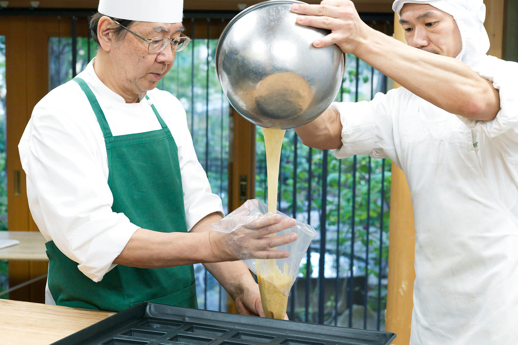口金をはめた絞り袋に口元を指でつまみながら生地を移す。型に生地を絞るときは、型いっぱいにではなく、8割程度にとどめる。180度に予熱したオーブンに生地を絞った型を入れ、15分焼いたら、200度に温度を上げて12分焼く。